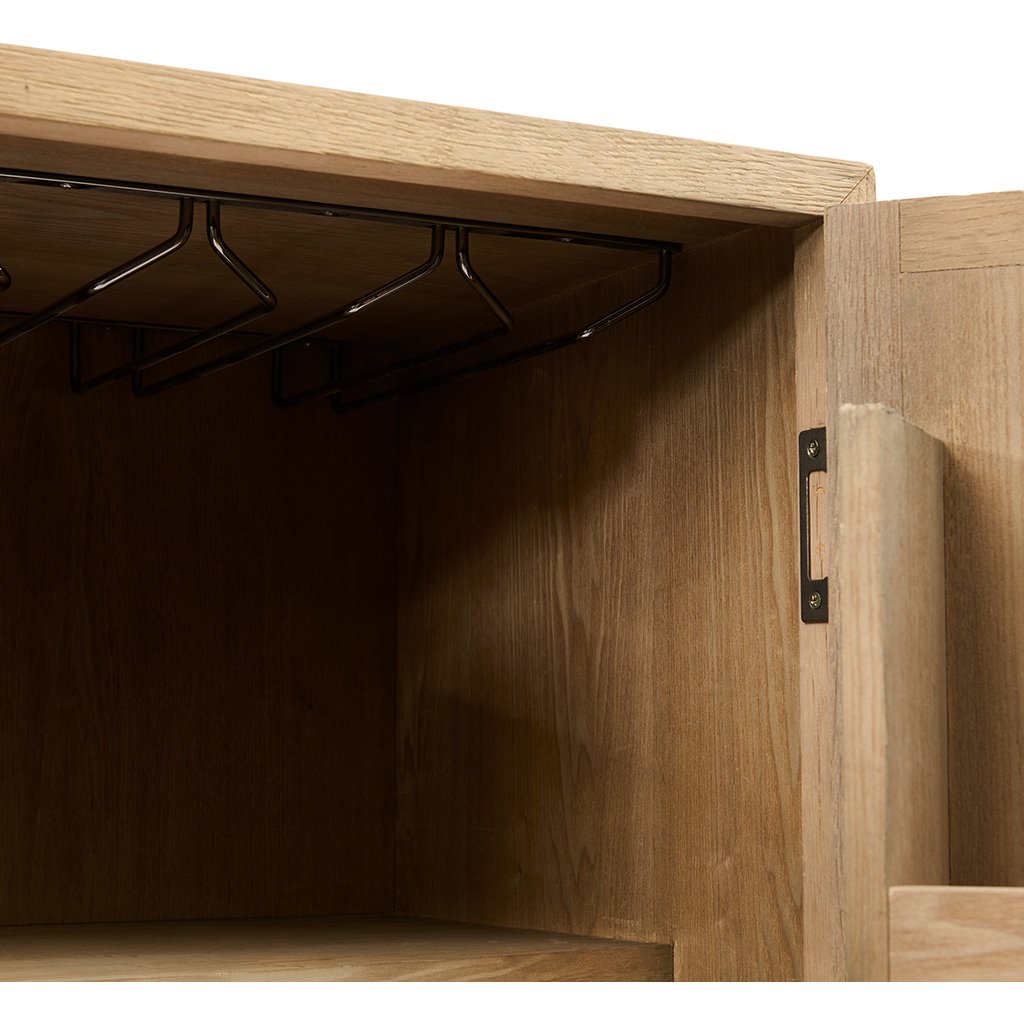 Táto skrinka na vysokých nohách má rám z nehrdzavejúcej ocele a kovové úchyty. Dvierka vyrobené z regenerovaného dubového dreva vyzerajú ako ručne tkané a dodávajú skrini jedinečný vzhľad. Vo vnútri táto vinotéka ponúka tri priestranné priehradky a štyri menšie priehradky za ďalšími dvoma dvierkami, ako aj stojan na vínny pohár a magnetické zatváranie pre väčšie pohodlie. Zodpovedajúci príborník s dvomi zásuvkami možno umiestniť pod barovú skrinku, aby pôsobila celistvo, alebo ju možno použiť samostatne a vystihnúť tak štýl celej miestnosti.Dodatočné parametre