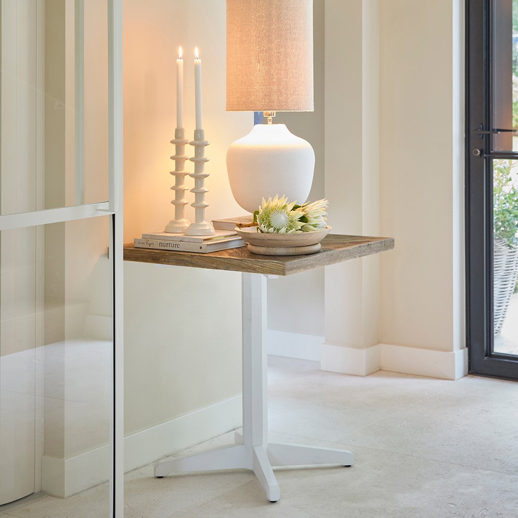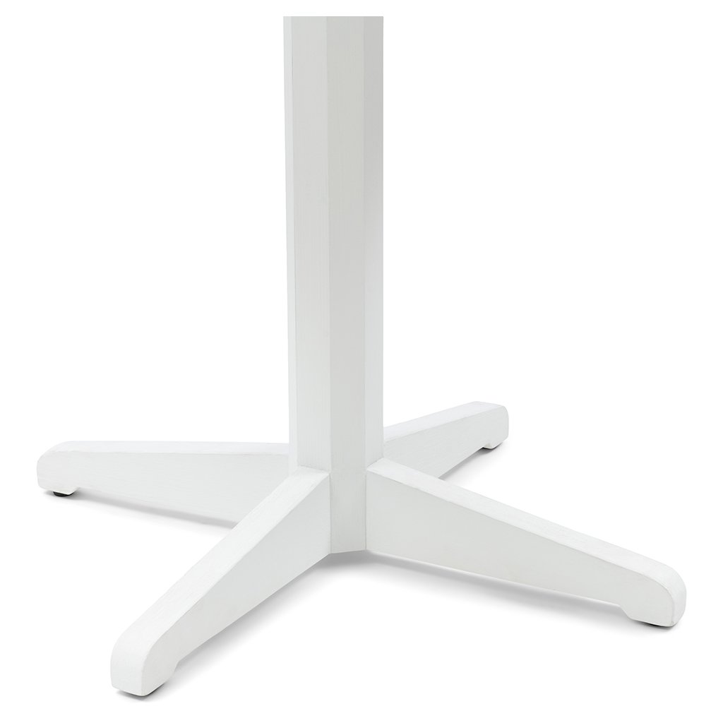 Tento štvorcový bistro stôl spája moderné a klasické prvky do elegantného celku. Drevená doska so vzorom rybej kosti dodáva moderný nádych, zatiaľ čo biele nohy prinášajú rustikálny šarm. Ideálny na vytvorenie štýlového a vyváženého vzhľadu vášho interiéru.Dodatočné parametre