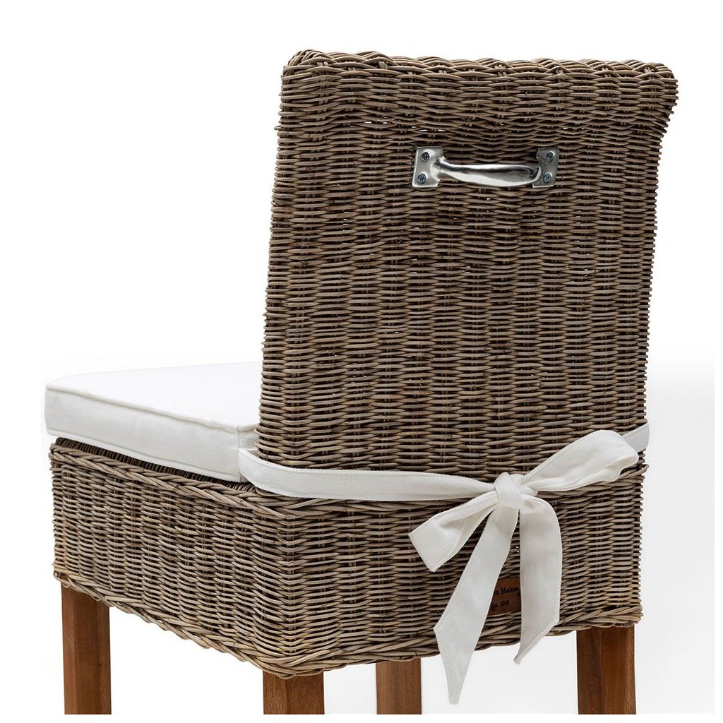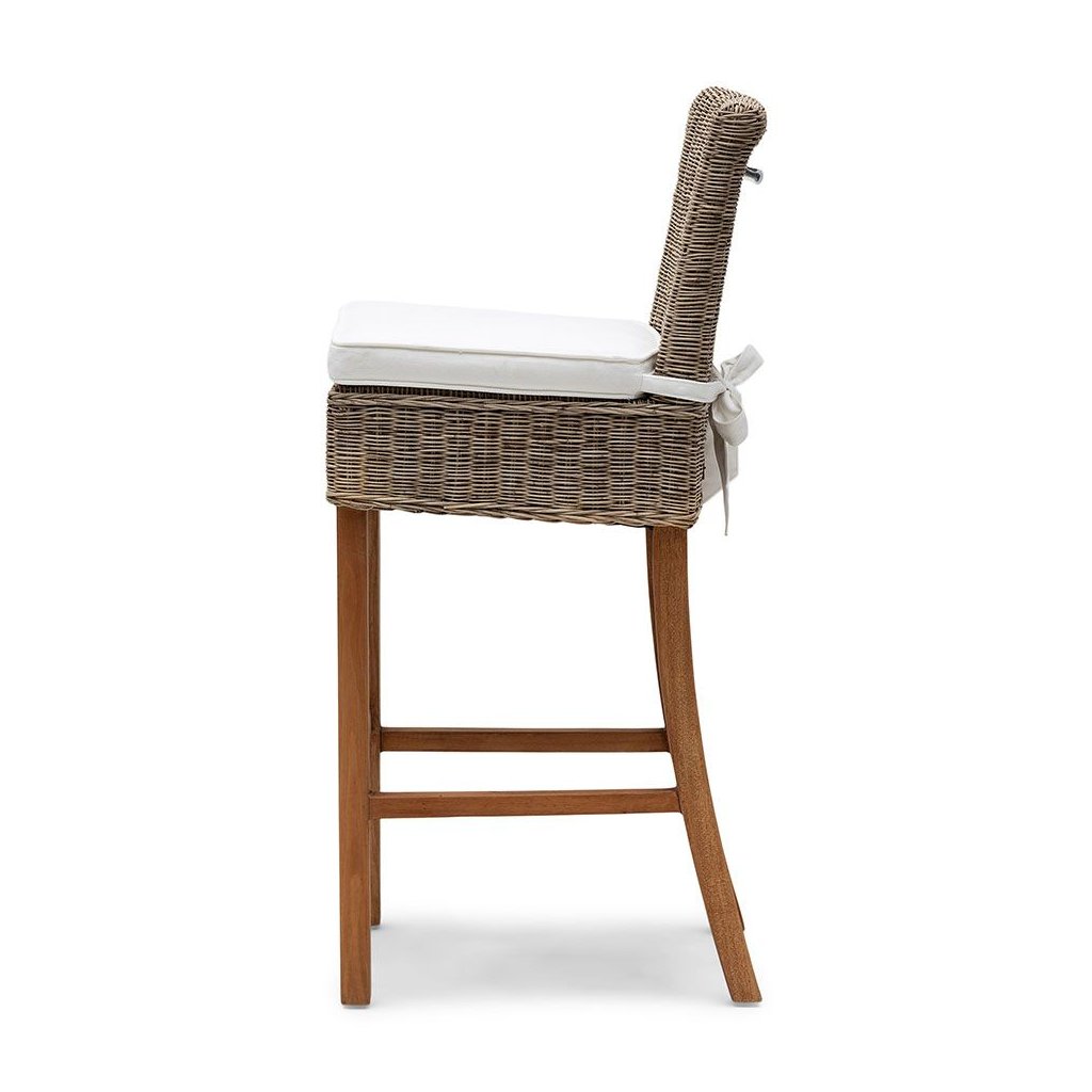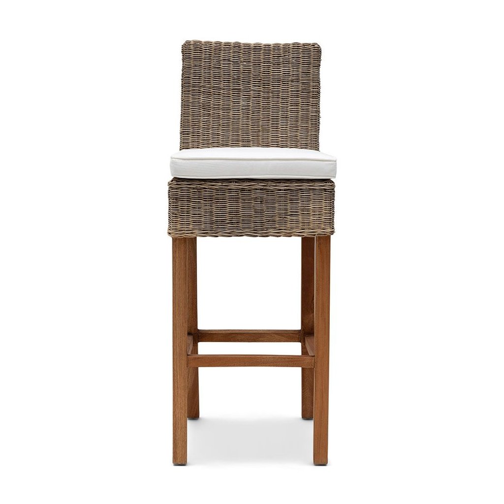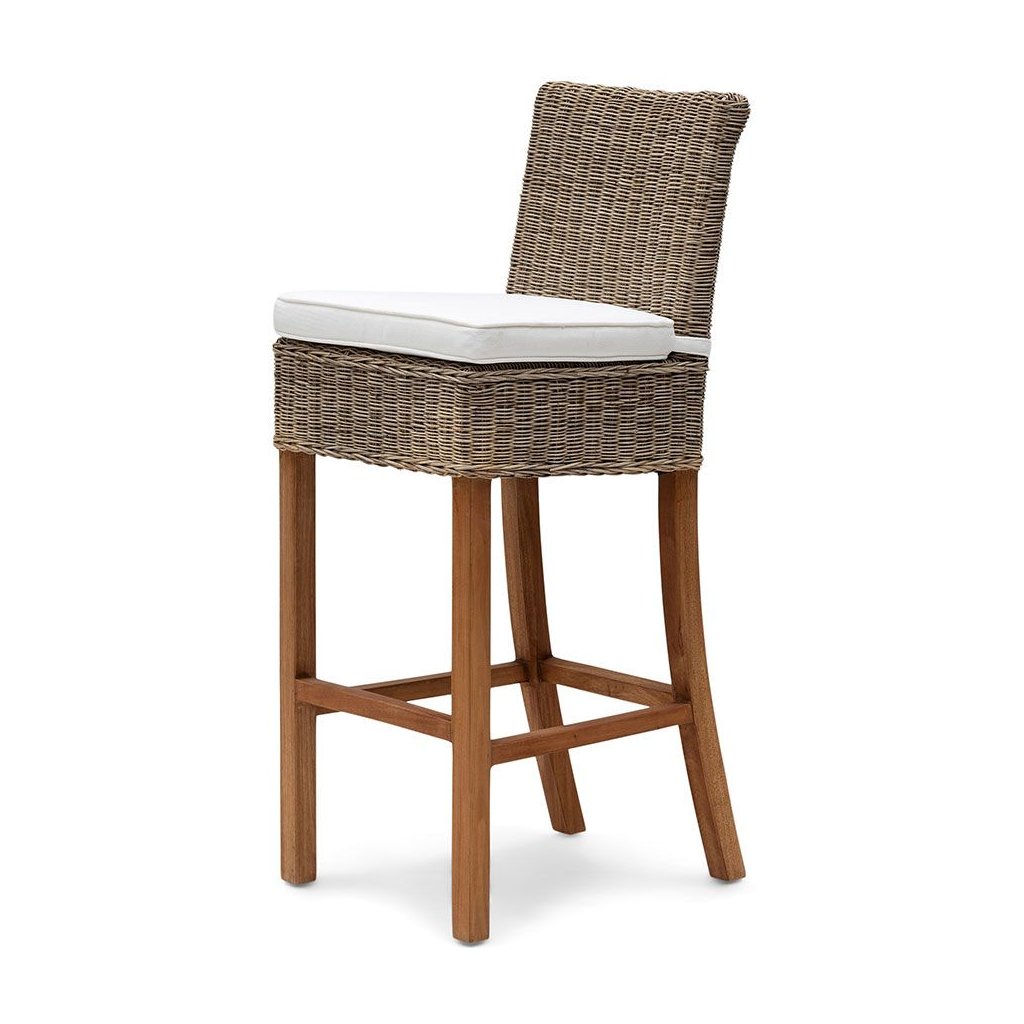 Barová stolička z ručně tkaného přírodního ratanu a masivní dřevěné podnože. Šedá barva ratanu vzniká přírodním procesem, a proto se barva může kus od kusu mírně lišit, což znamená, že každý kus nábytku je jedinečný. Potah sedáku je vyroben ze 100% bavlny.