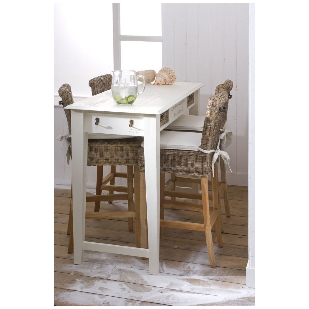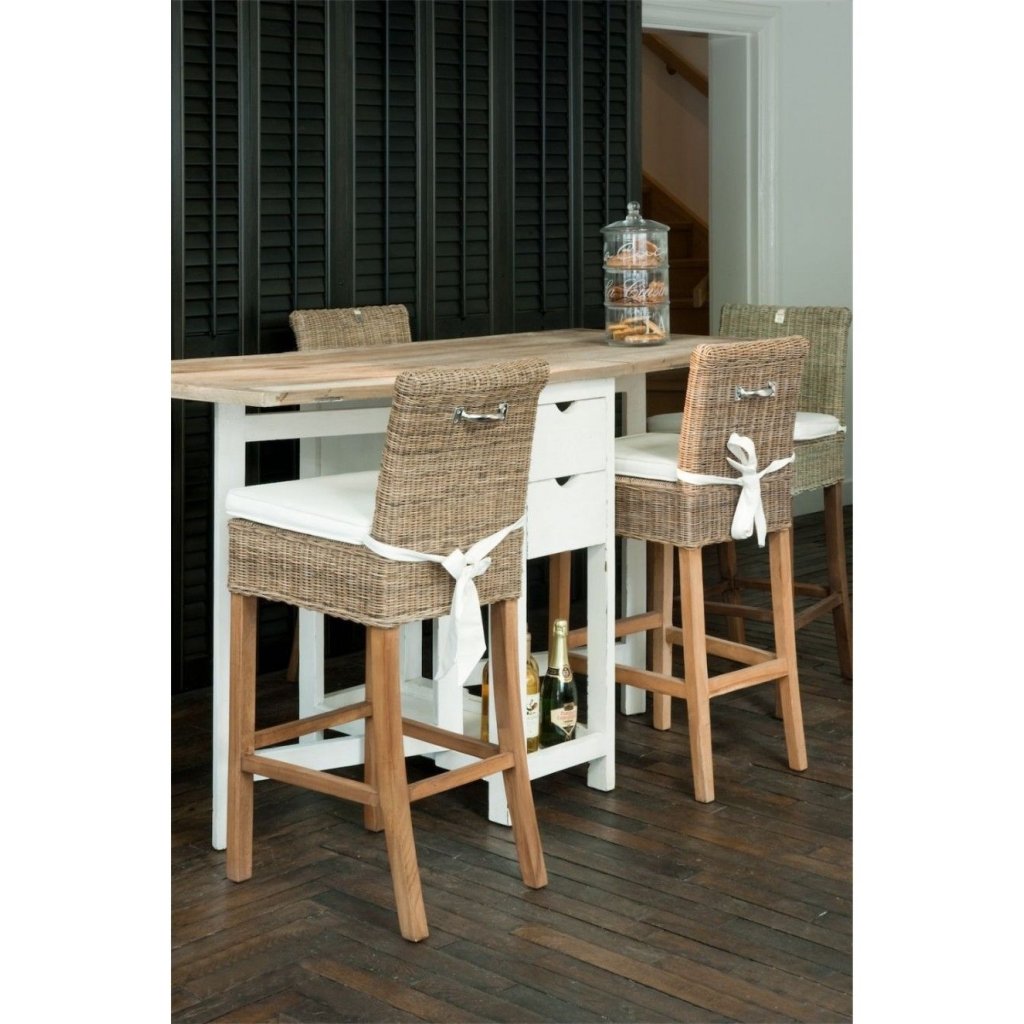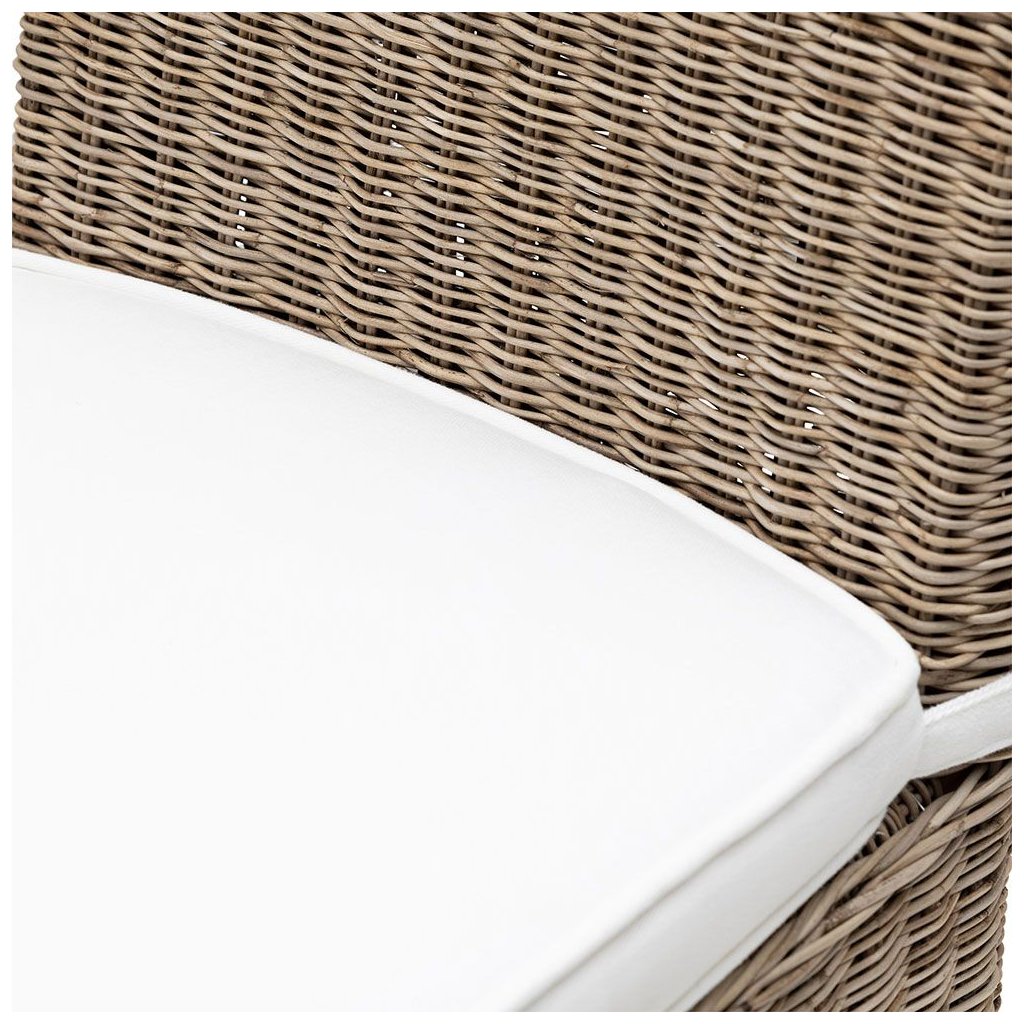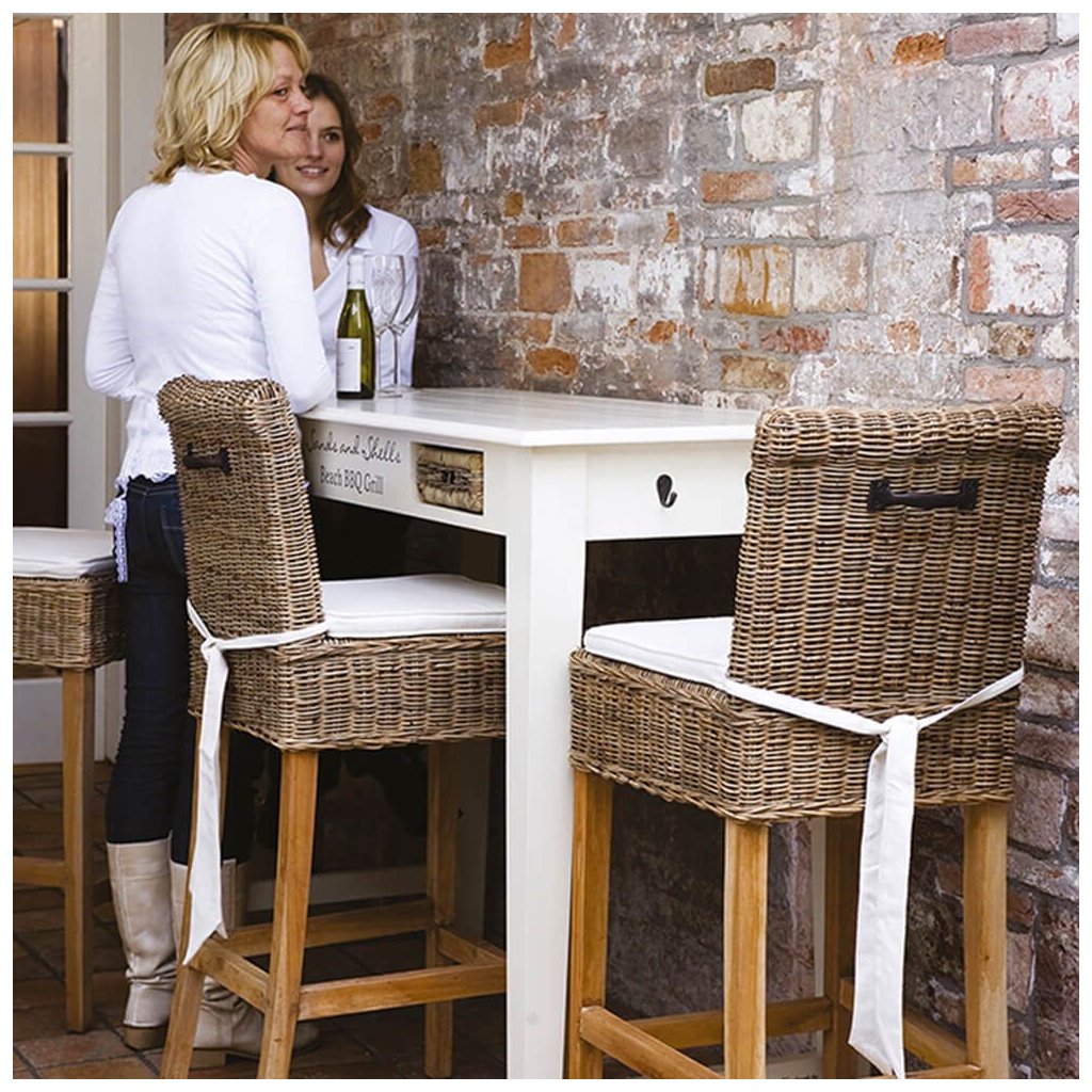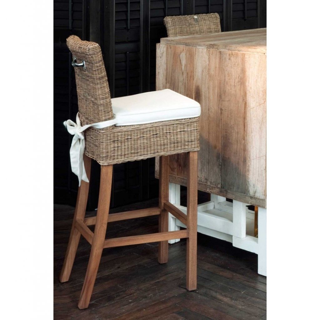 Barová stolička z ručně tkaného přírodního ratanu a masivní dřevěné podnože. Šedá barva ratanu vzniká přírodním procesem, a proto se barva může kus od kusu mírně lišit, což znamená, že každý kus nábytku je jedinečný. Potah sedáku je vyroben ze 100% bavlny.