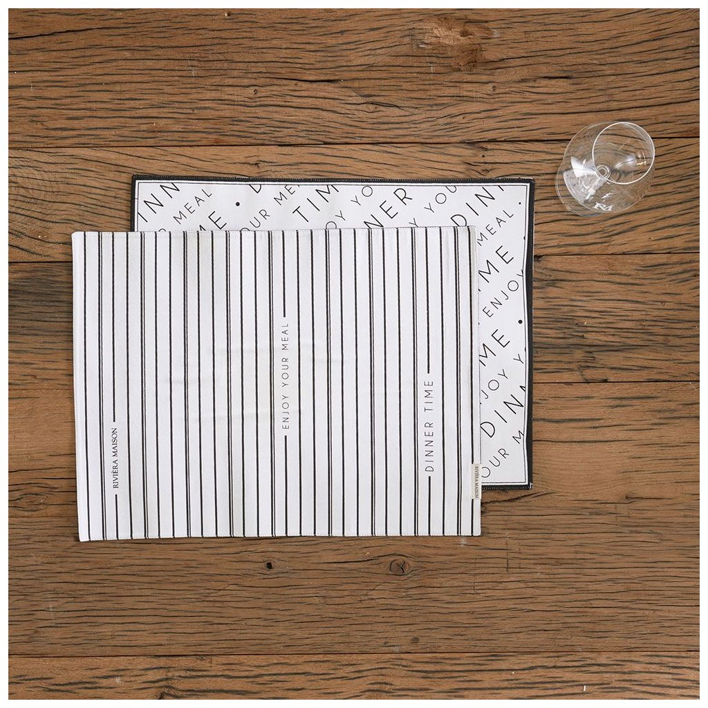 Dva ubrousky Dinner Time Rev, které vyzývají k odložení talířů. Jsou podélně pruhované, s texty Rivièra Maison, Enjoy Your Meal a Dinner Time. Jsou však samozřejmě vhodné i na snídani nebo oběd.Lze je použít z obou stran.