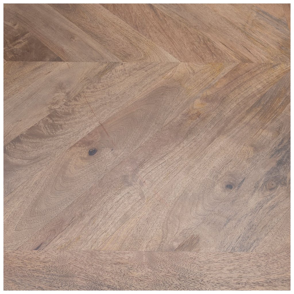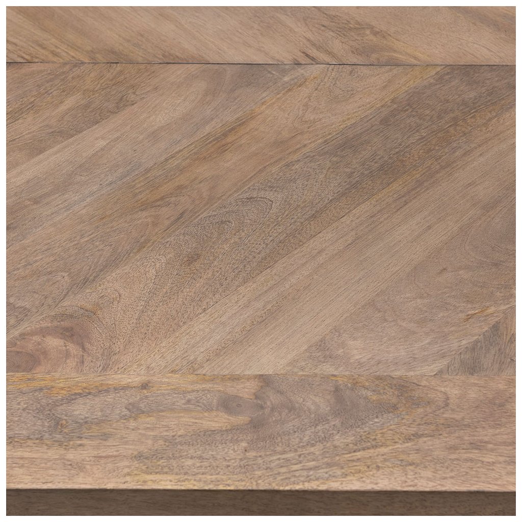 Deska stolu je vyrobena z recyklovaného mangového dřeva a je podepřena čtyřmi nohami, které se spojují na podlaze a tvoří robustní a vkusný rám.
