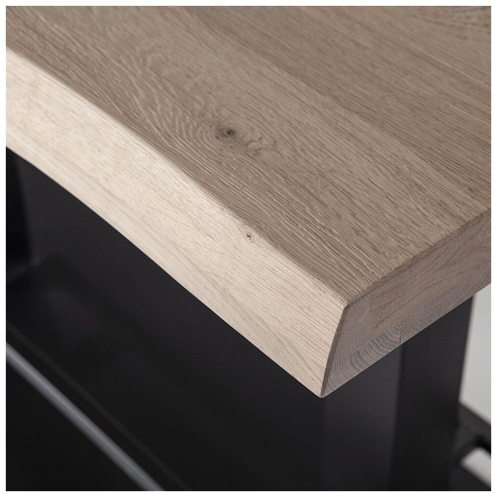 Barový stůl s kovovou podnoží a krásným surovým dubovým dřevem.