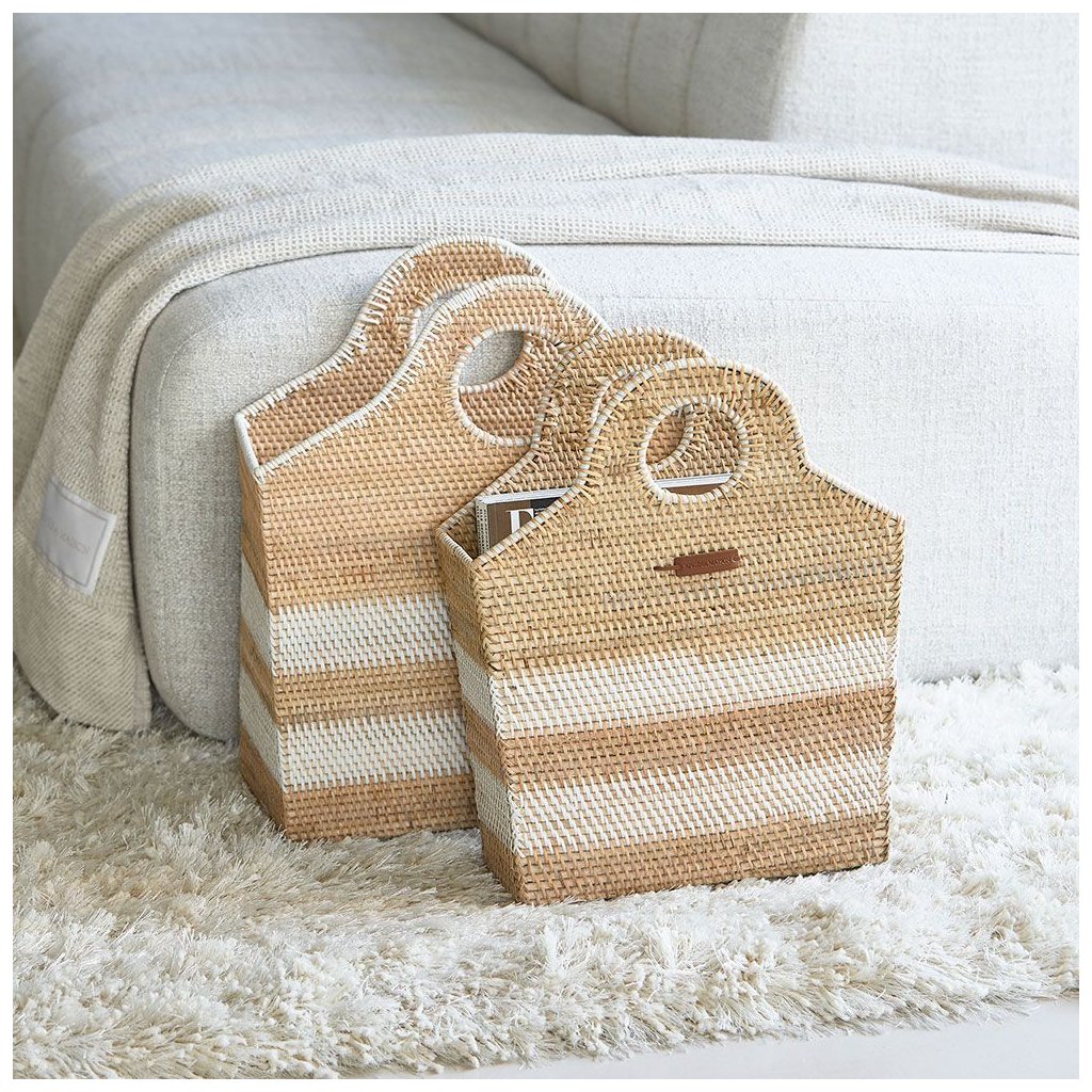 Jedná se o sadu dvou držáků časopisů Crystal Bay. Držáky mají různé velikosti, ale oba jsou vyrobeny z přírodního proutí, částečně z ratanového stonku a ručně tkané. Přes držáky zásobníků vede bíle lakovaná kolejnice a úchyty jsou z jednoho kusu. K dostání v různých povrchových úpravách.Doplňkové parametry