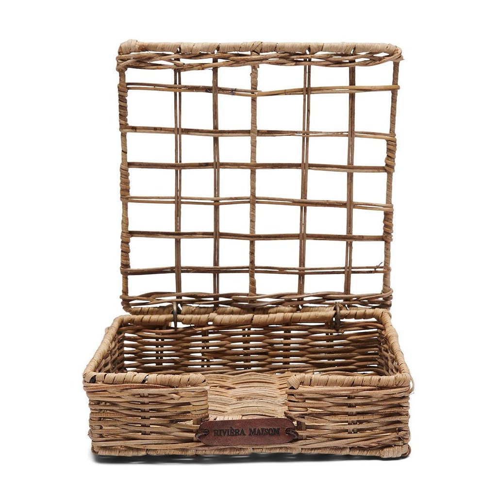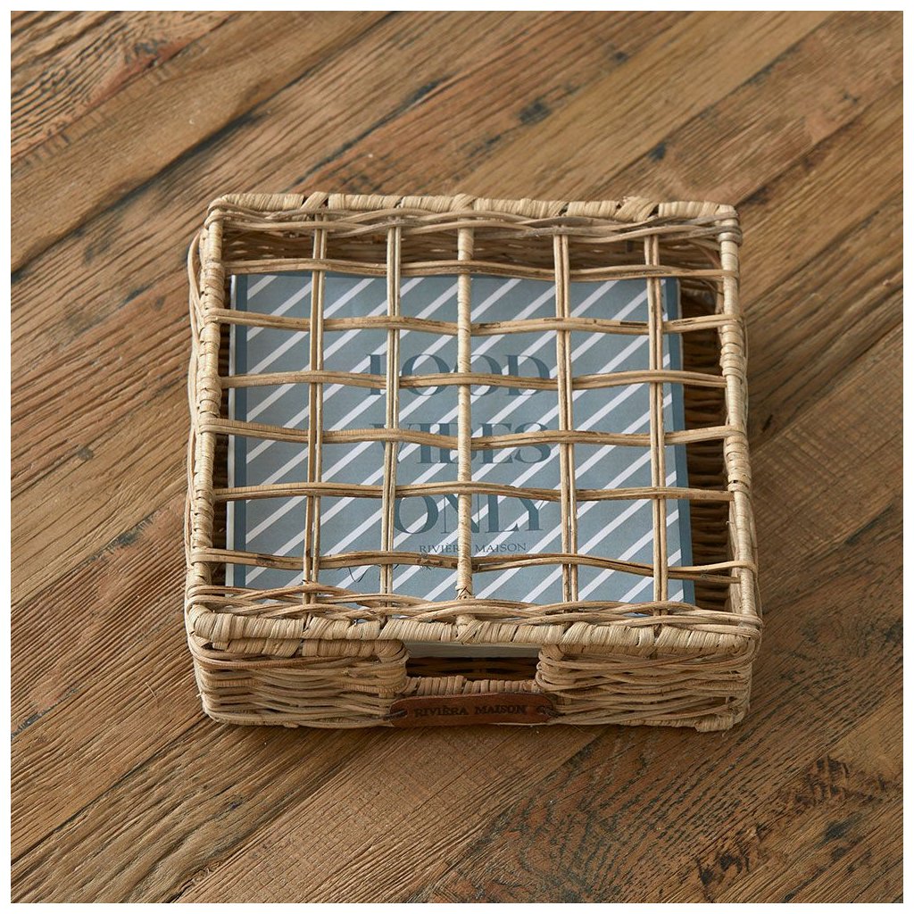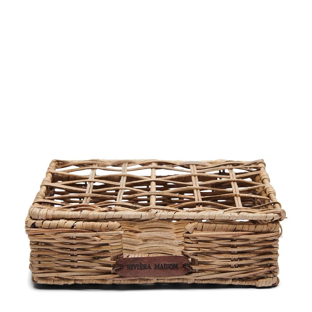 Prezentujte své ubrousky stylově v tomto rustikálním ratanovém držáku na ubrousky. Ažurové víko s ozdobným kosočtvercovým vzorem vám na první pohled ukáže, v jakém motivu můžete prostřít stůl. Na přední straně držáku na ubrousky je pod otvorem připevněn kožený štítek s logem Riviera Maison.