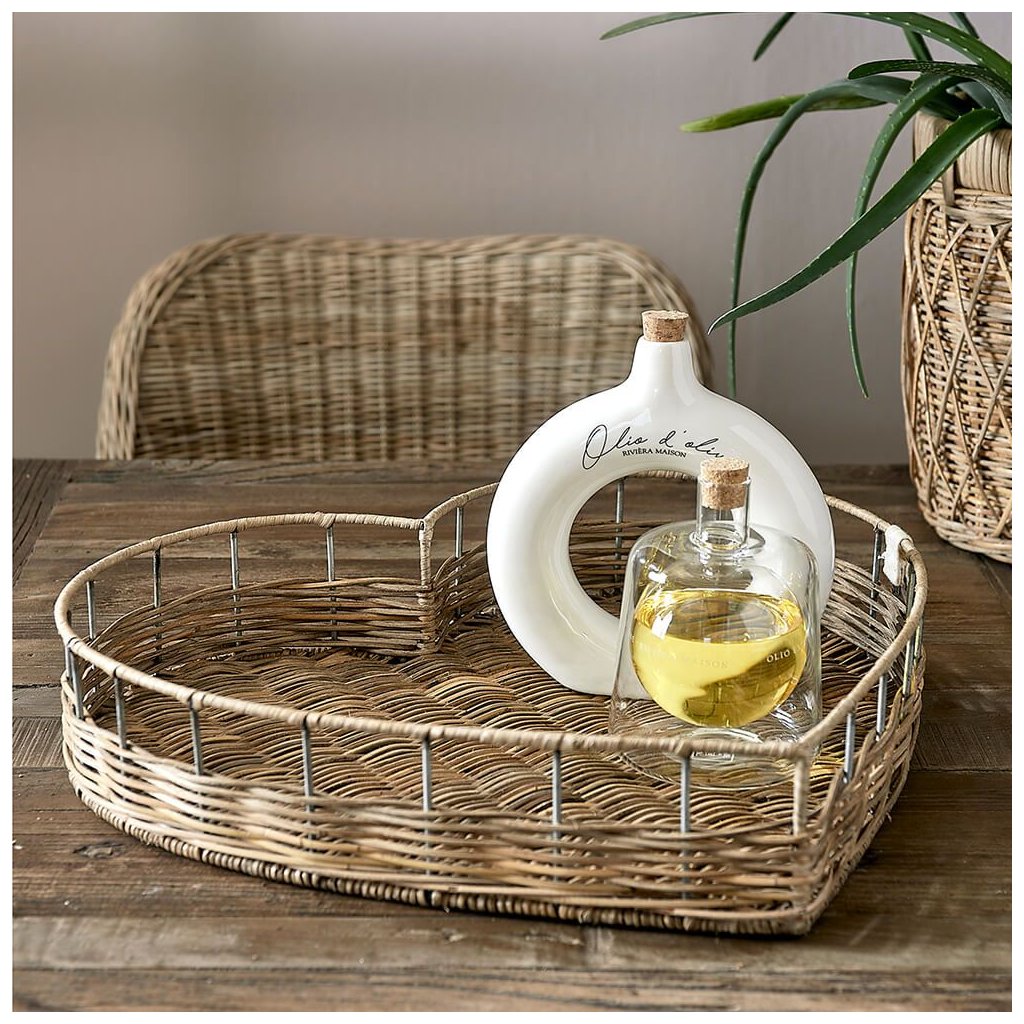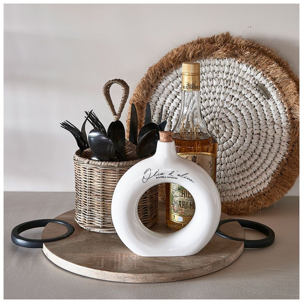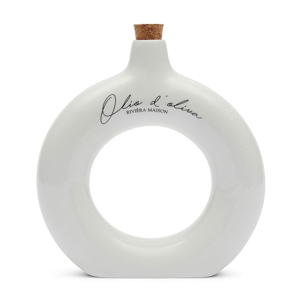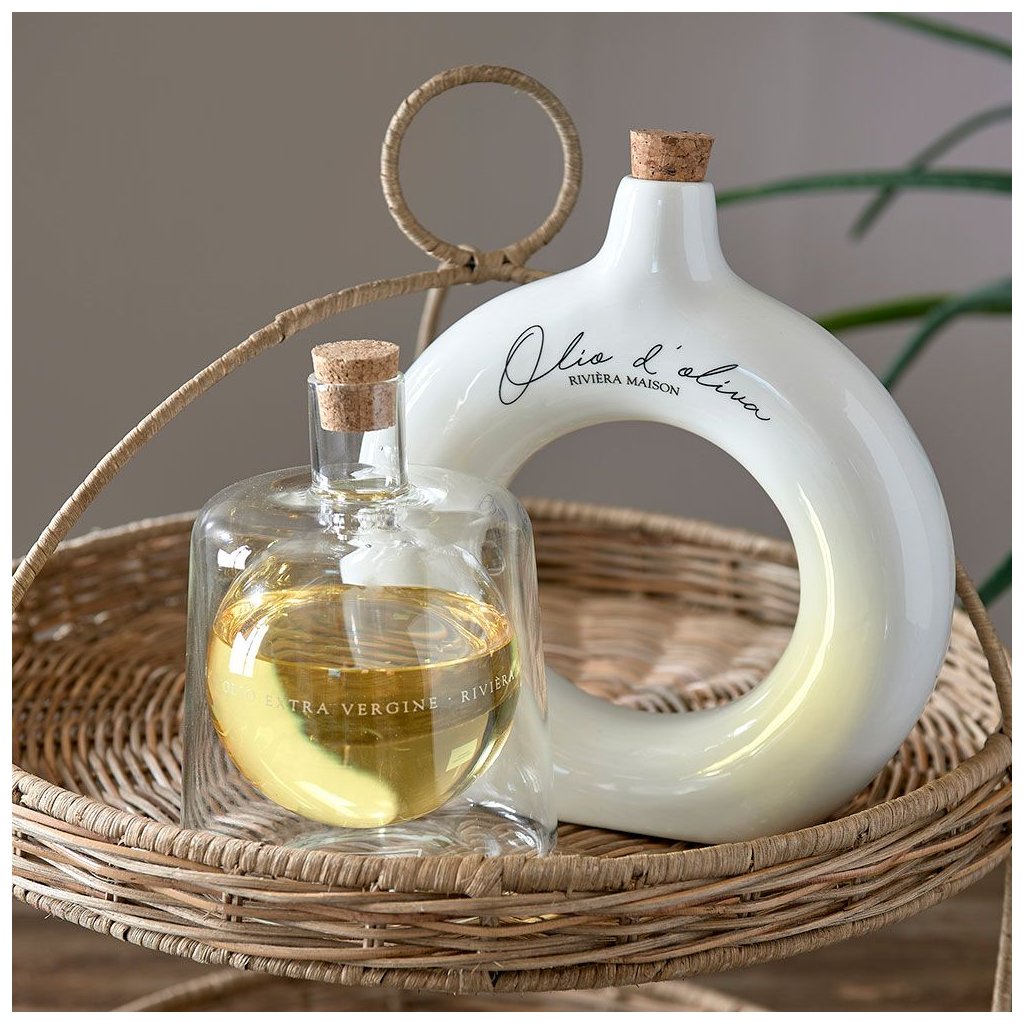 Tato zábavná kulatá láhev na olivový olej je ručně vyrobená z bílého porcelánu. Na bílé láhvi je tmavými písmeny napsáno: "Olio d'oliva, Rivièra Maison". Láhev lze otevřít a uzavřít korkovým uzávěrem. Postavte tuto krásnou láhev na stůl a dodejte jídlu výjimečnou chuť.Doplňkové parametry