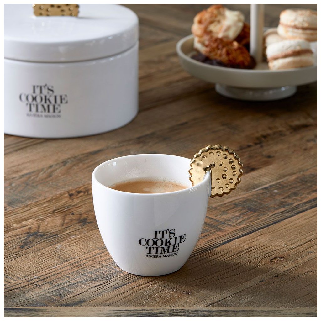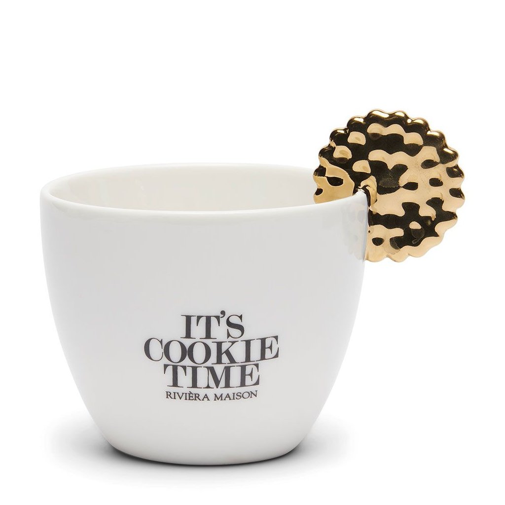 Hrnek It's Cookie Time je hrnek na kávu nebo čaj z bílého porcelánu. Na bílém hrnku je černý text "It's cookie time". Na dně na vnitřní straně je nápis "filling" (náplň). Ucho hrnku má zlatou barvu a má tvar sušenky. K dispozici je také odpovídající plechovka na sušenky.Doplňkové parametry