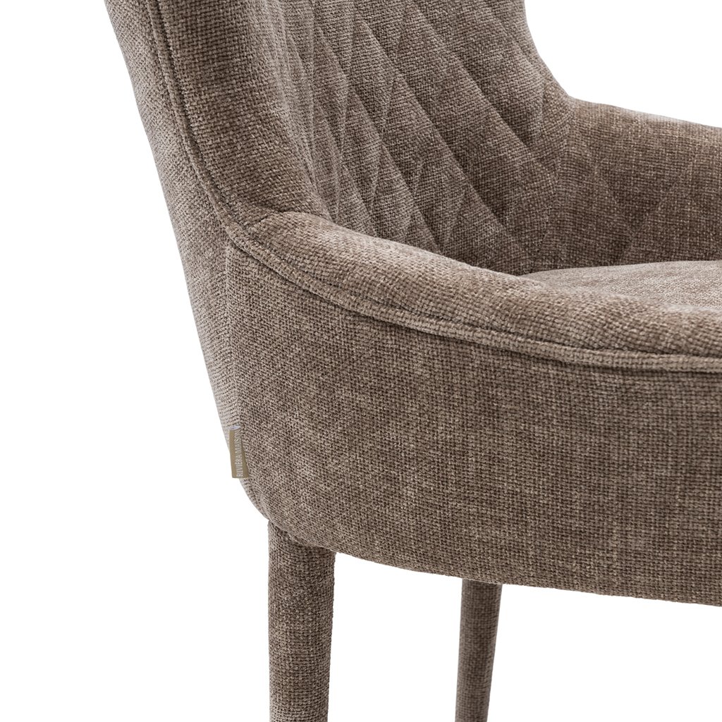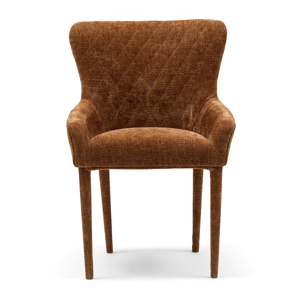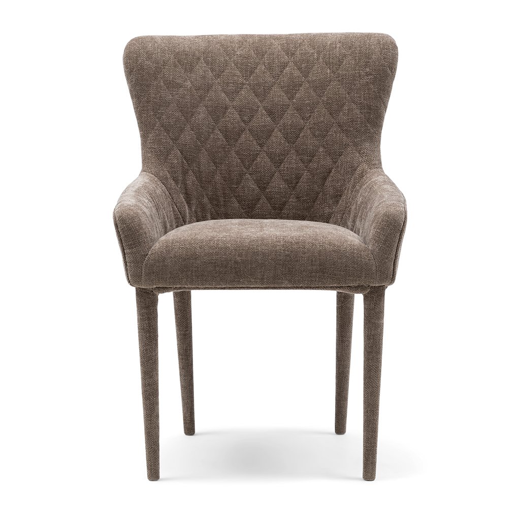 Tato jídelní židle s područkami nabízí dokonalou rovnováhu mezi pohodlím a elegancí. Kombinované čalounění, které elegantně přiléhá k nohám, a kostkované prošívání přispívají k modernímu vzhledu. Hluboký sedák a vysoký opěrák zaručují maximální pohodlí při sezení. Díky svému modernímu designu se tato židle bez problémů hodí do různých stylů interiéru, takže se stane univerzálním a stylovým doplňkem vašeho jídelního prostoru.Doplňkové parametry