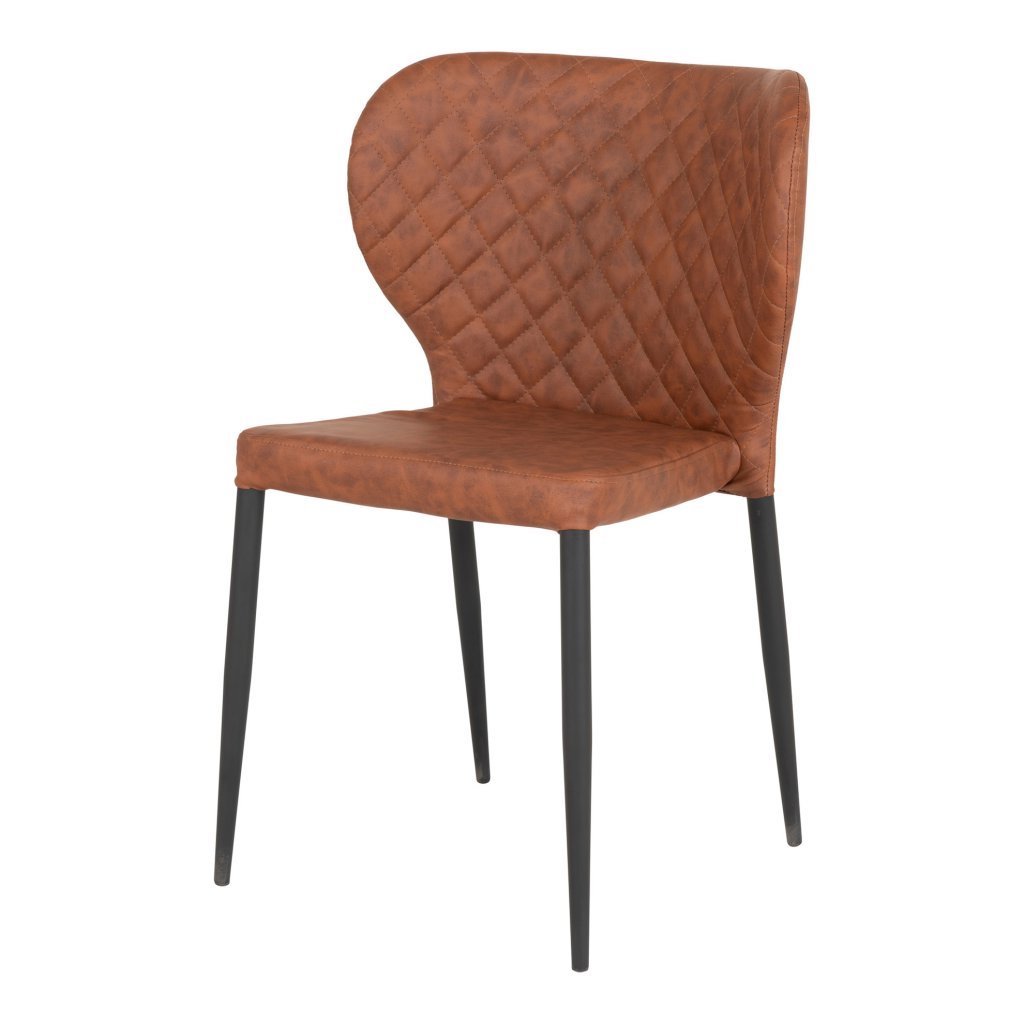 Stylová jídelní židle s vintage hnědým potahem z PU kůže a černými kovovými nohami. Kombinuje elegantní design s pohodlným sezením a je ideální do moderních i industriálních interiérů. Snadno udržovatelný materiál zaručuje dlouhou životnost. Stohovatelná židle