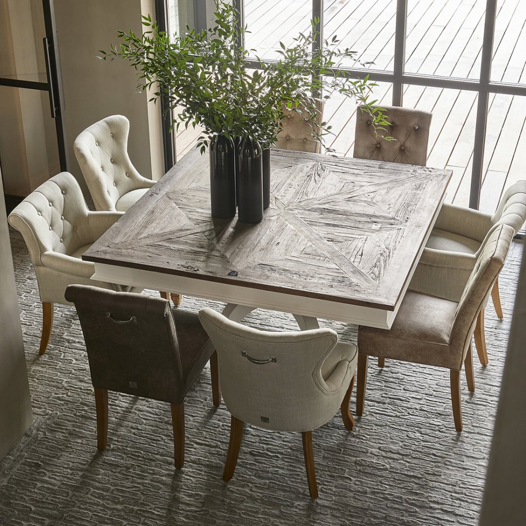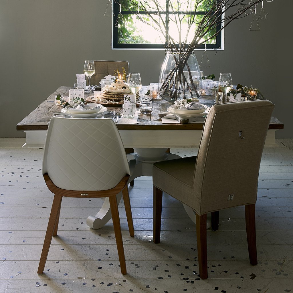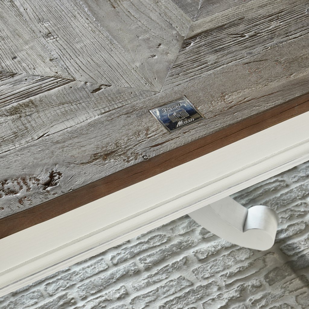 Desky stolů z kolekce Chateau Belvedere jsou inspirovány podlahami starých zámků. Nejmenší velikost stolu je ideální pro koutek "jen pro nás dva", zatímco dva dohromady tvoří skvělý jídelní stůl. K dostání v různých velikostech.