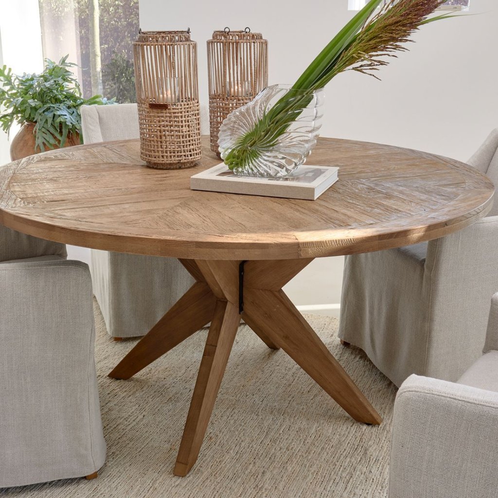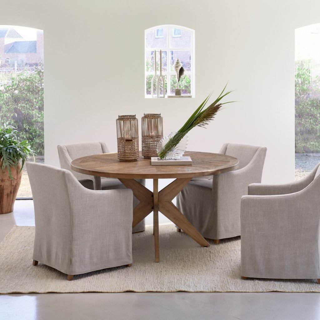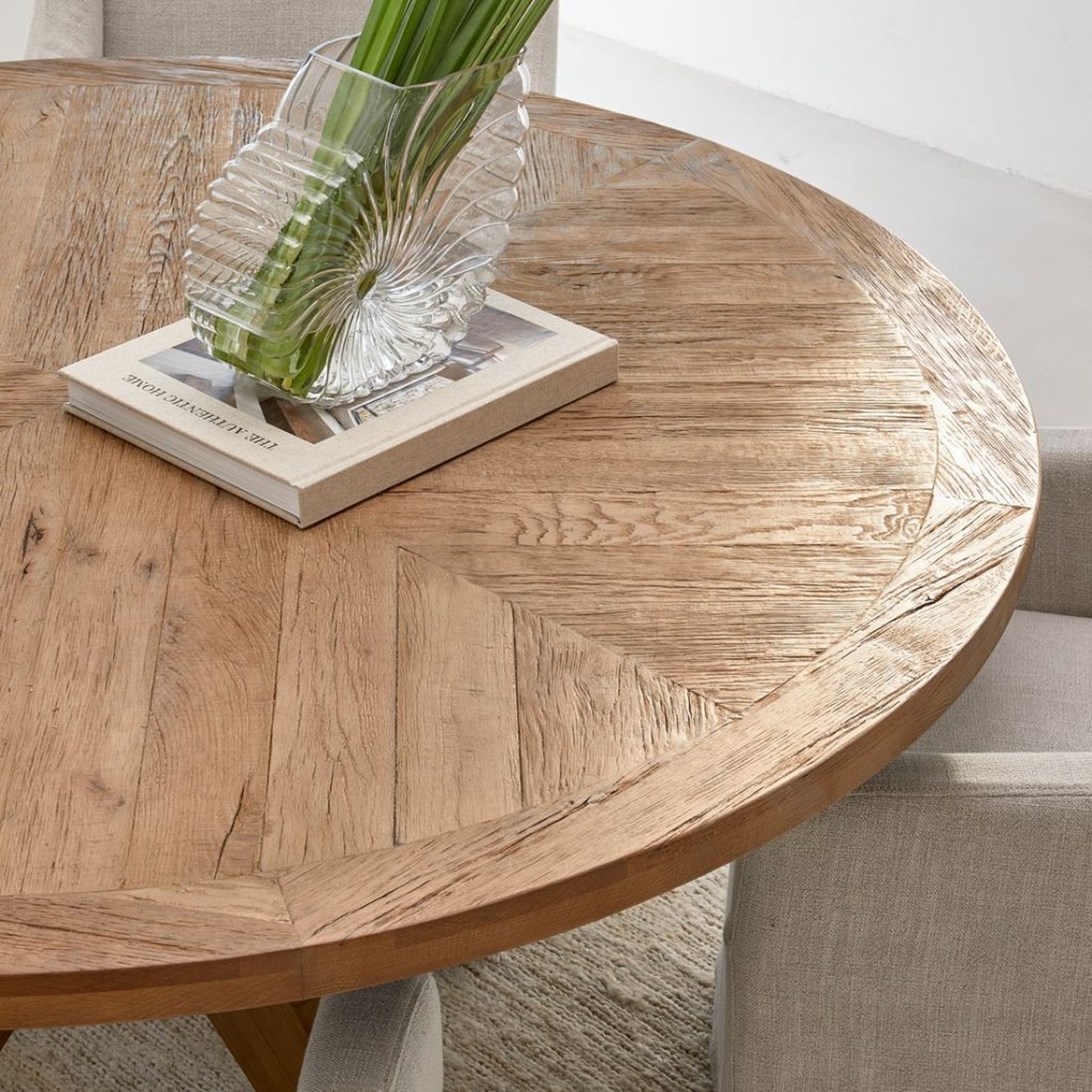 Portland je kulatý dřevěný jídelní stůl, jehož deska je vykládaná, vyrobený z regenerovaného dubového dřeva v tzv. Dřevo je velmi rozmanité, pokud jde o barevné odstíny a texturu. Křížová podnož tohoto jídelního stolu je rovněž vyrobena z dubového masivu. Stůl je k dispozici také v obdélníkovém provedení.Doplňkové parametry