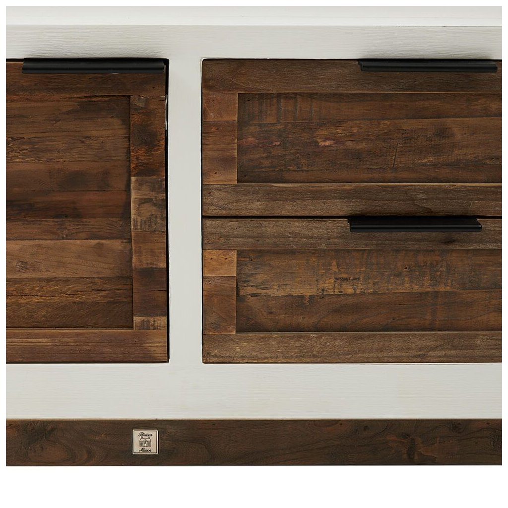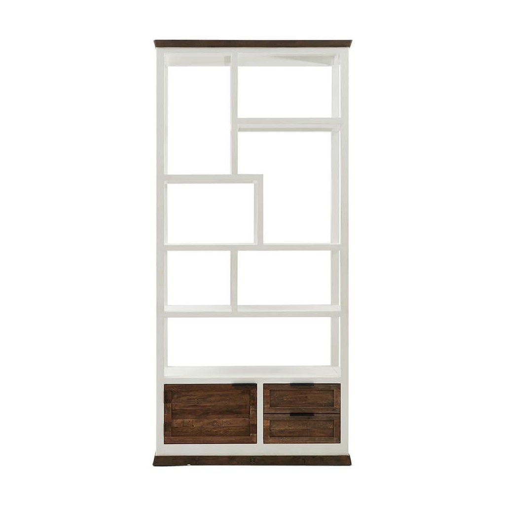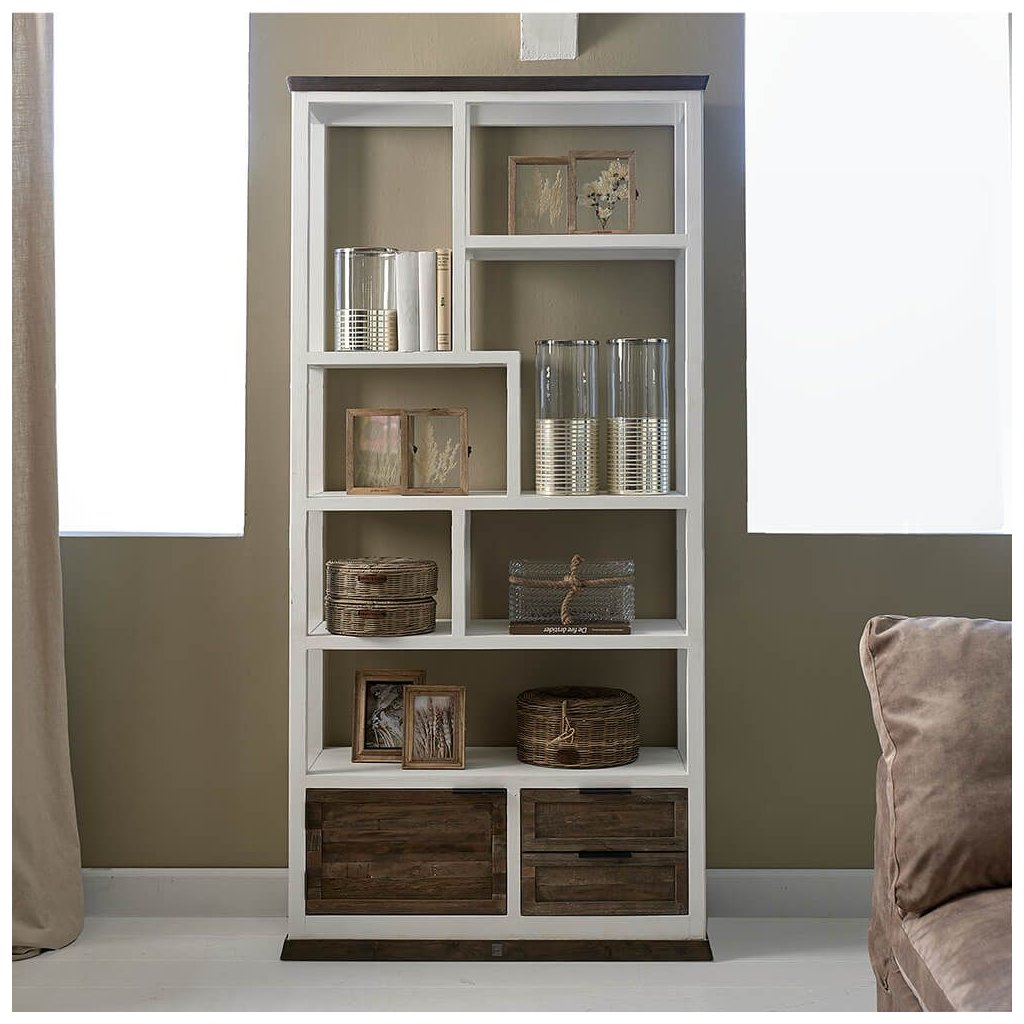 Vysoká skříňka na knihy Metropolitan se pyšní charakteristickým vzhledem Riviera Maison, který kombinuje nelakovaný starý recyklovaný jilm a bílý topol s moderním ažurovým designem a tmavými úchyty. Ve spodní části jsou dvě zásuvky a dvířka.