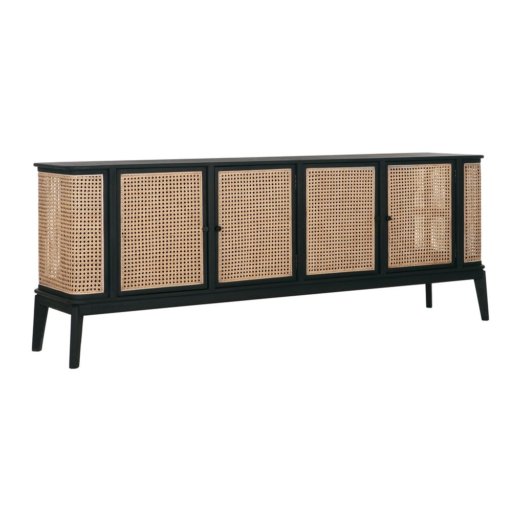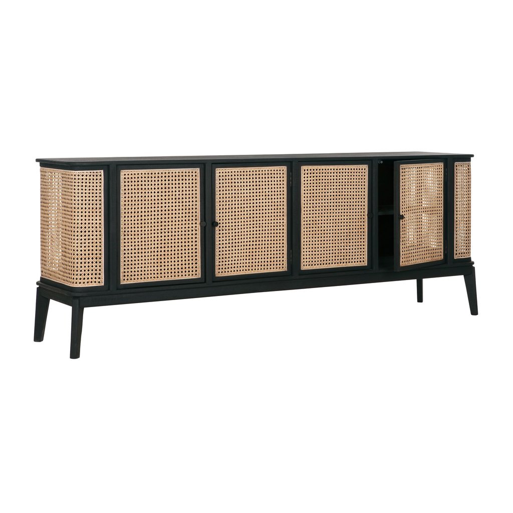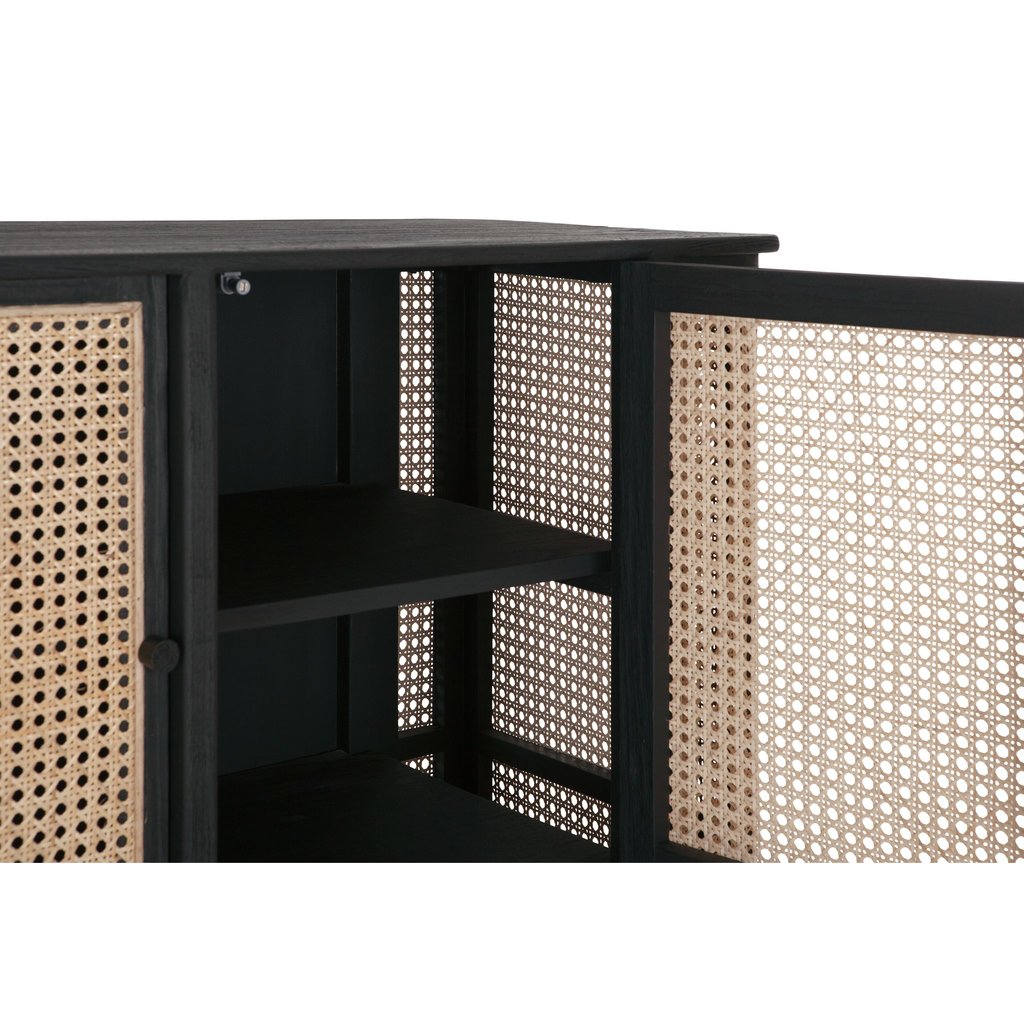 Komoda Raffles má rozměry 80 × 213 × 48 cm. Komoda má 4 dvířka, takže nabízí dostatek úložného prostoru. Kombinace černého dřeva mindi a přírodního výpletu vytváří retro vzhled.