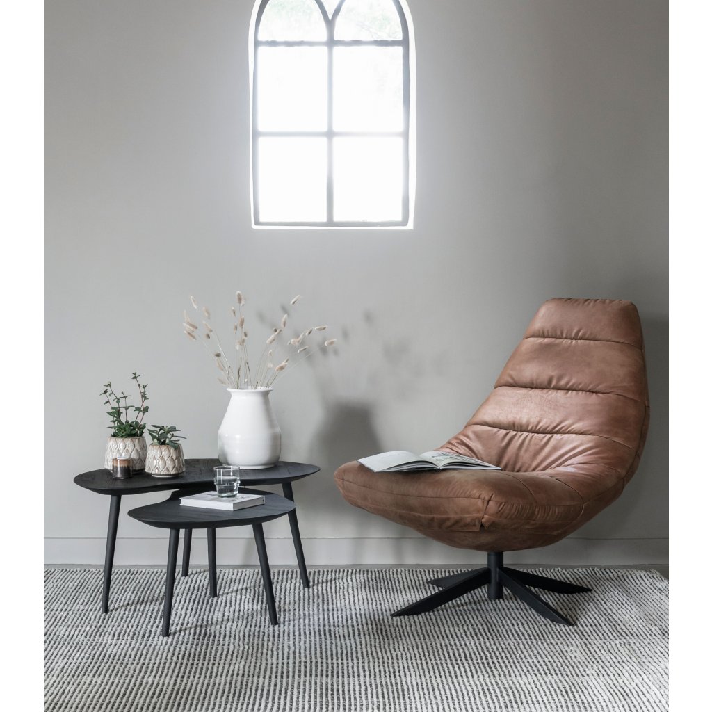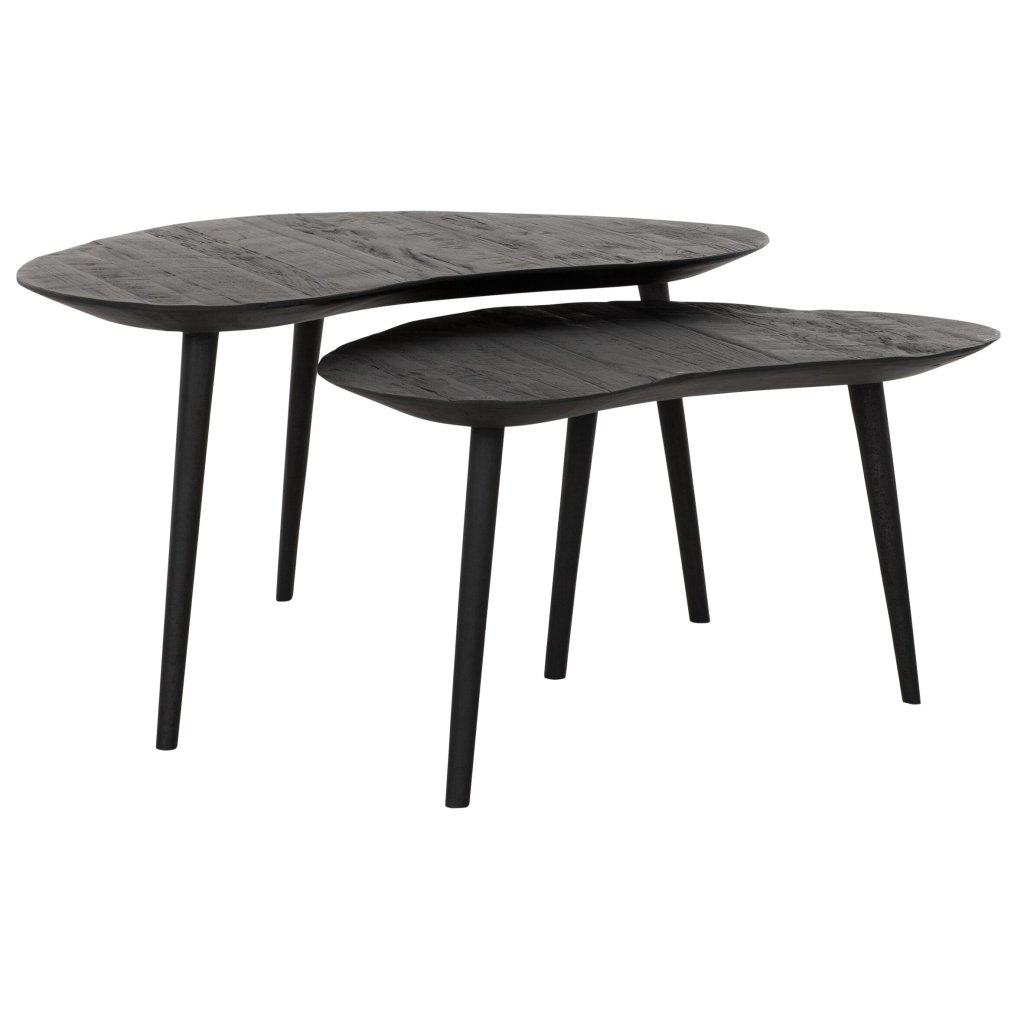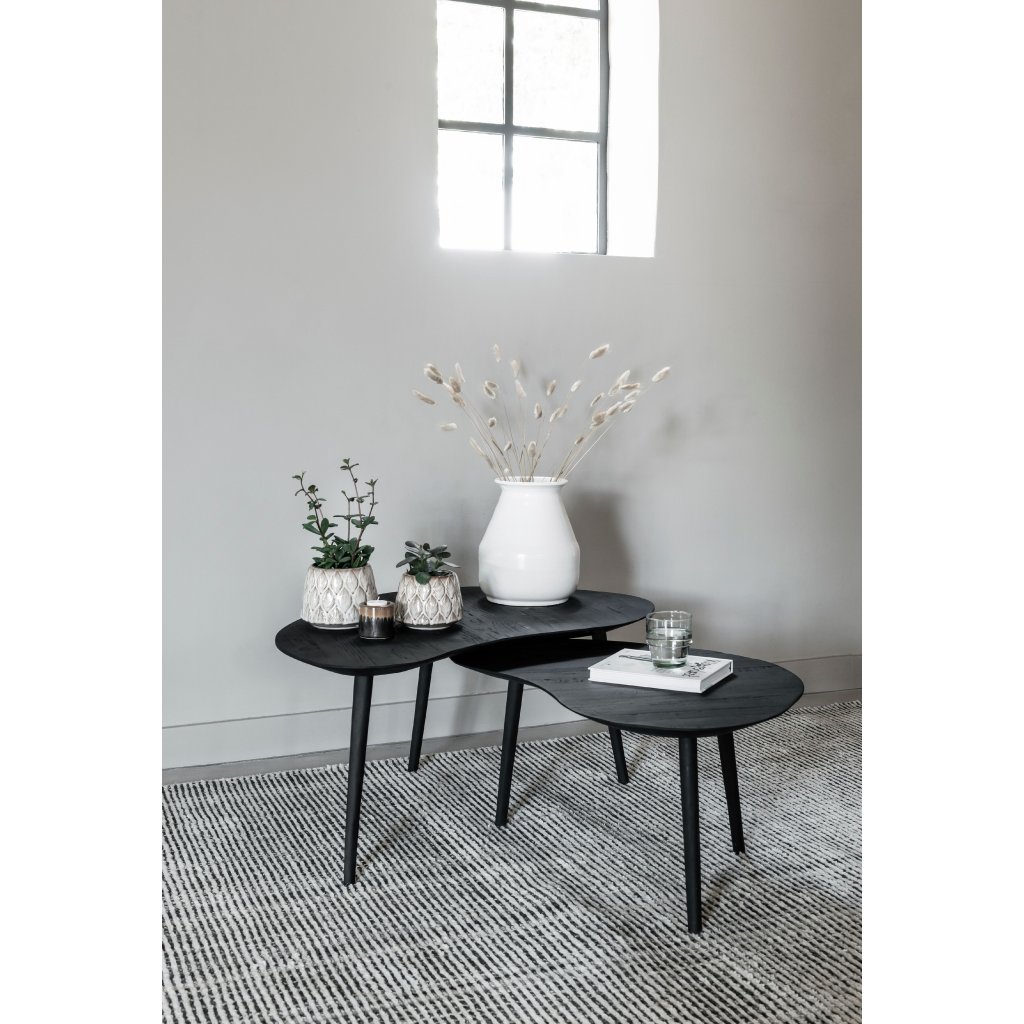 Designový konferenční stolek Organus Black je k dispozici jako sada 2 kusů, které vašemu interiéru dodají originální vzhled a přirozenou eleganci. Desky stolů jsou vyrobeny z recyklovaného teakového dřeva, které se vyznačuje autentickou strukturou a odstíny, díky nimž je každý kus jedinečný. Robustní kovová základna zajišťuje stabilitu a dodává stolům moderní charakter. Díky svému neobvyklému tvaru se stanou výrazným prvkem vašeho obývacího pokoje a praktickým místem pro servírování nebo ukládání dekorací. Rozměry jsou 35x69x51 cm a 40x83x61 cm.Doplňkové parametry