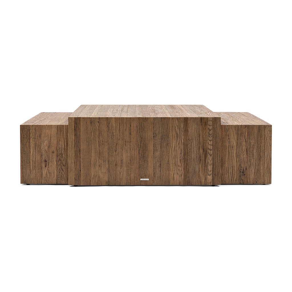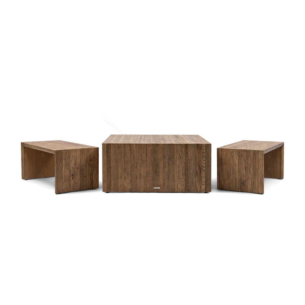 Tento konferenční stolek vyzařuje teplo a charakter díky kombinaci barev dřeva a jedinečnému vzoru, který dává vyniknout každému stolku. Konstrukce se skládá ze tří samostatných částí: dvou menších, které lze zasunout pod větší stolek. Tento důmyslný design kombinuje funkčnost s estetikou, takže stolek je nejen praktický, ale také výrazným prvkem v každém obývacím pokoji. Velký stolek: Vnitřní část stolu je tvořena z dvou částí, které se nacházejí na okraji stolu: V: 42 cm x Š: 90 cm x H: 90 cm Malý stolek: V: 37 cm x Š: 80 cm x H: 40 cmDoplňkové parametry