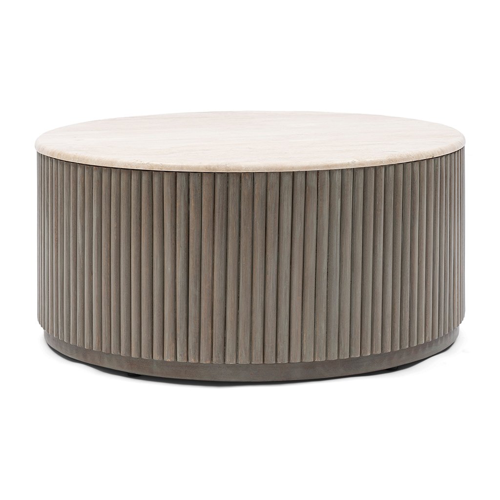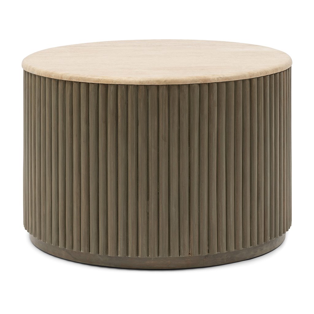 Tento kulatý konferenční stolek se stane elegantním doplňkem vašeho obývacího pokoje. Travertinová deska nabízí elegantní a nadčasový vzhled, díky němuž se stane výrazným prvkem v každém interiéru. Široká podnož zakončená lamelami z mangového dřeva vytváří moderní vzhled a dodává designu stabilitu a charakter. Tento konferenční stolek je ideální pro dodání luxusního nádechu vašemu interiéru a působí jako krásný ústřední bod ve vašem obývacím pokoji.Doplňkové parametry