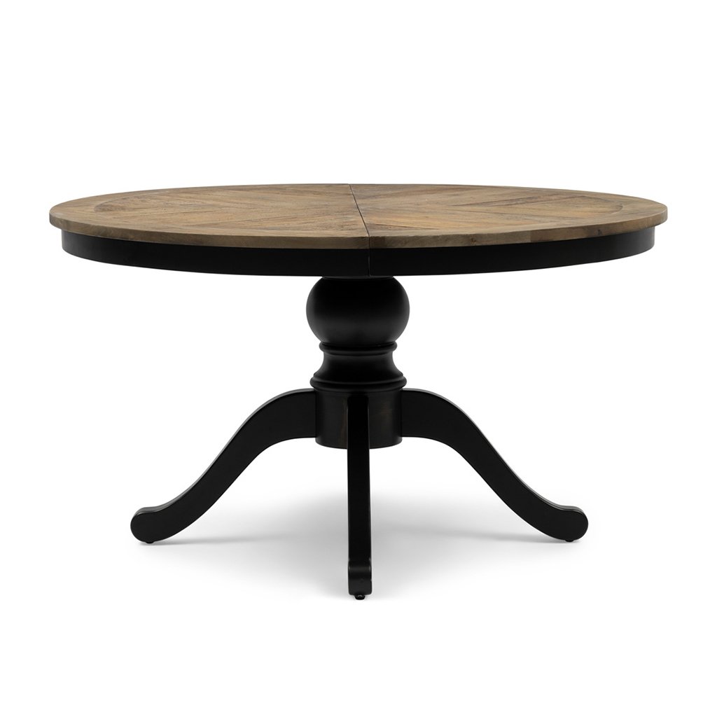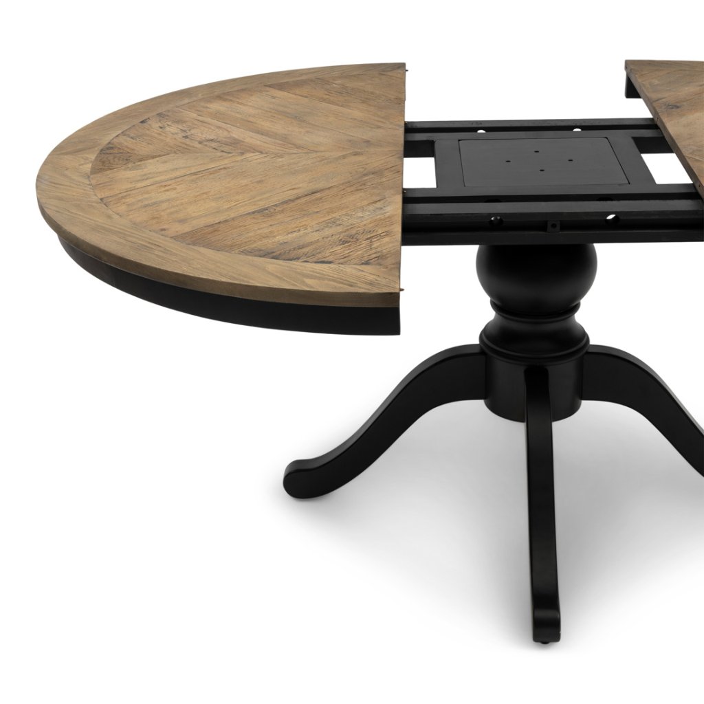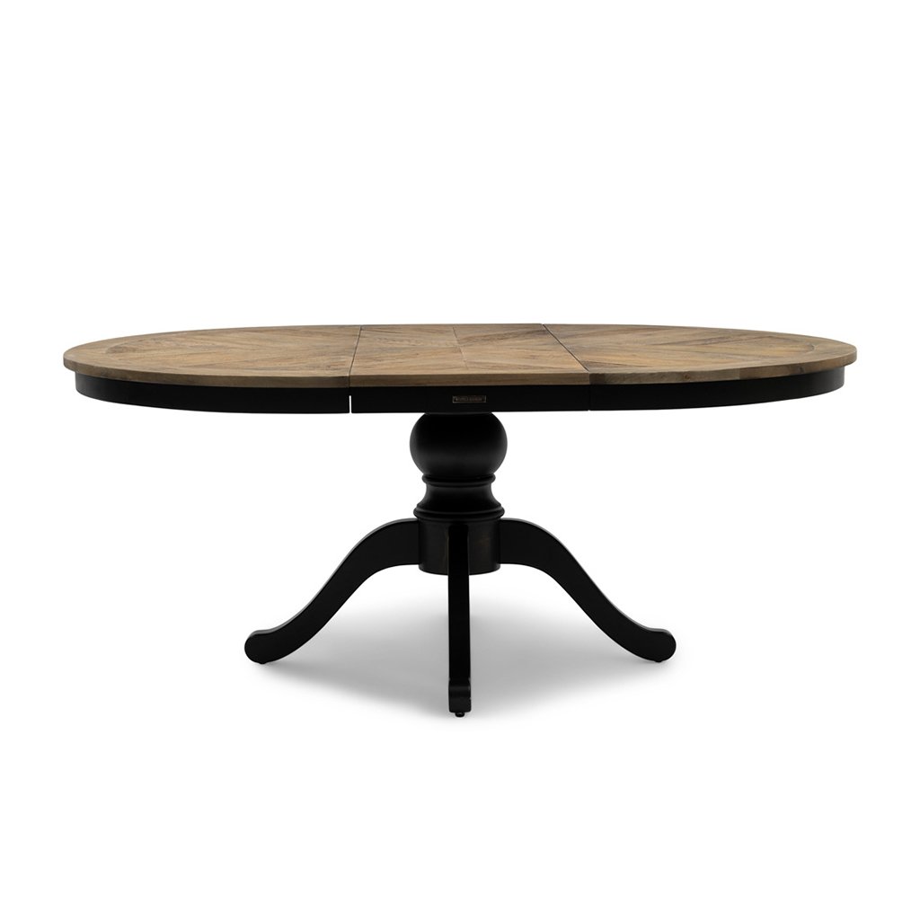 Hledáte prostorově úsporný stůl s klasickým vzhledem a moderním nádechem? Pak je rozkládací jídelní stůl Le Marais skvělou volbou. Tento kulatý stůl s deskou z tmavého recyklovaného dubu a kulovitými nohami z topolového dřeva lze rozložit na oválný model. Protože je noha uprostřed, můžete si kolem stolu snadno sednout.