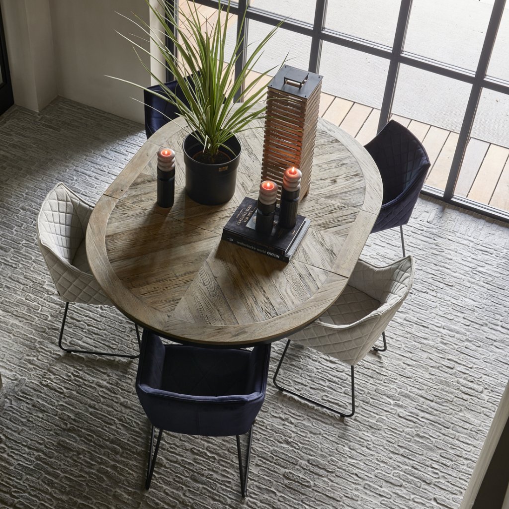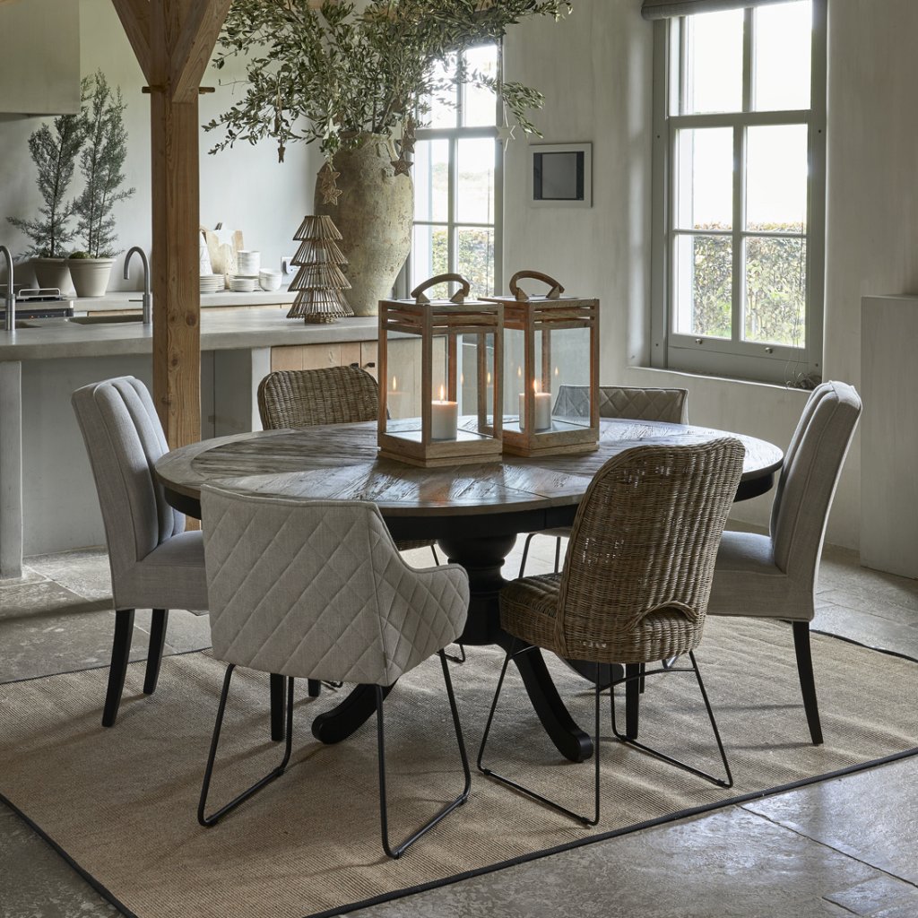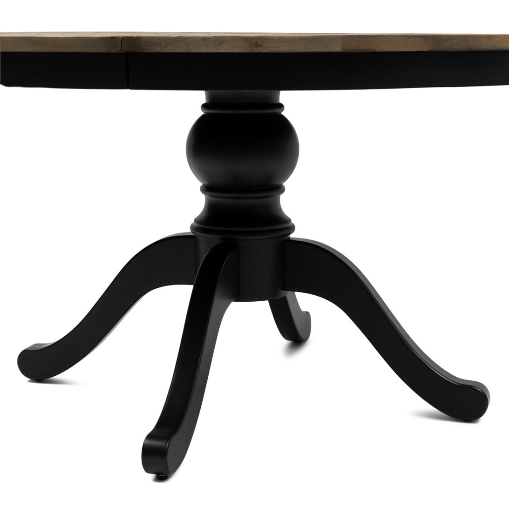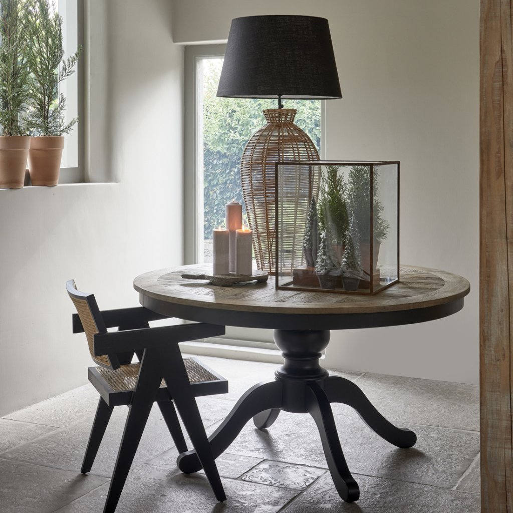 Hledáte prostorově úsporný stůl s klasickým vzhledem a moderním nádechem? Pak je rozkládací jídelní stůl Le Marais skvělou volbou. Tento kulatý stůl s deskou z tmavého recyklovaného dubu a kulovitými nohami z topolového dřeva lze rozložit na oválný model. Protože je noha uprostřed, můžete si kolem stolu snadno sednout.