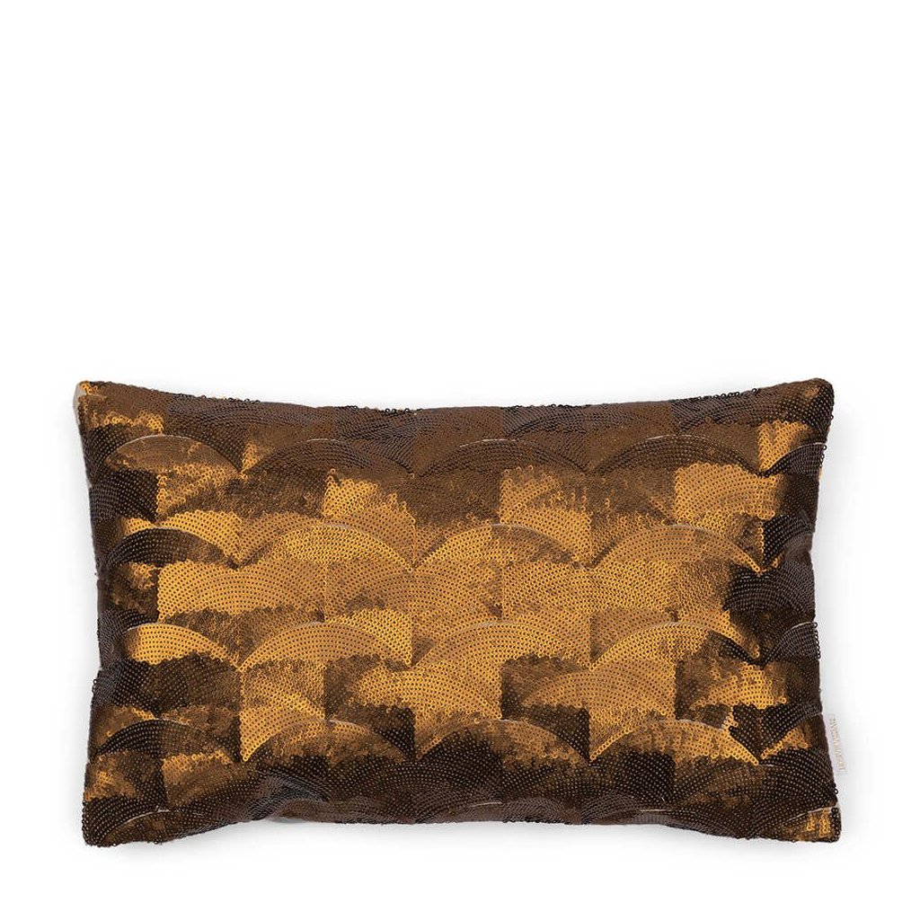Na přední straně tohoto povlaku na polštář jsou ručně navlečeny tisíce třpytivých hnědých a zlatých palet v grafickém vzoru. Zadní strana polštáře je z hladké bavlny a zip je skrytý ve švu na boku.