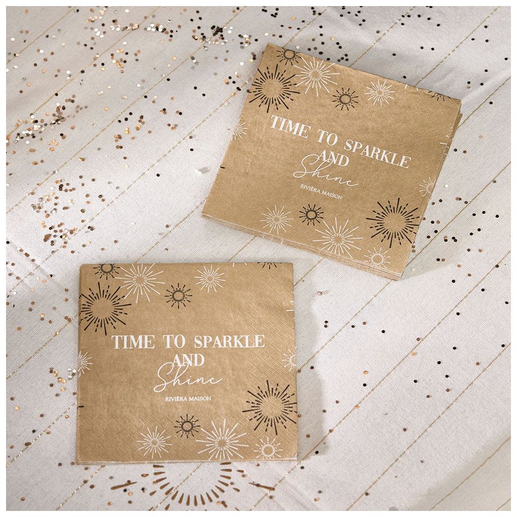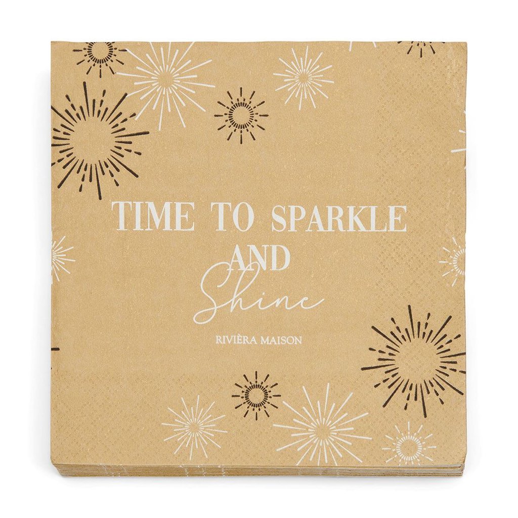 Čas na ohňostroj! Na těchto ubrouscích zlaté barvy vybuchují bílé a černé hvězdy ohňostroje. Papírové ubrousky jsou baleny po 20 kusech. Mezi všemi ohňostroji je bílým písmem napsáno "Čas jiskřit a zářit".