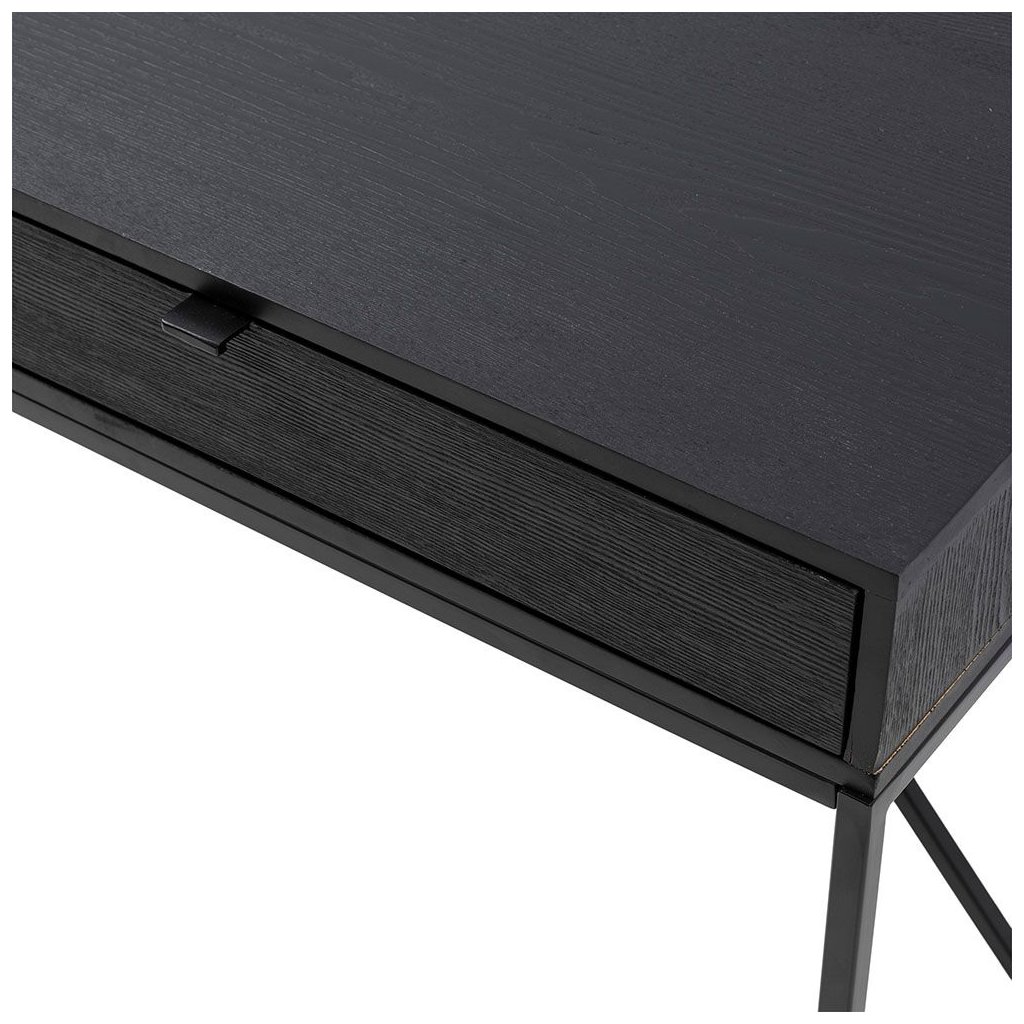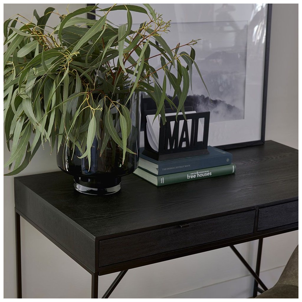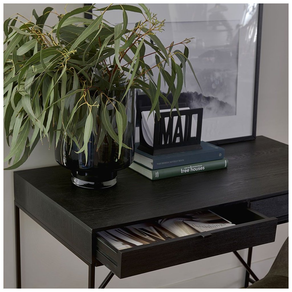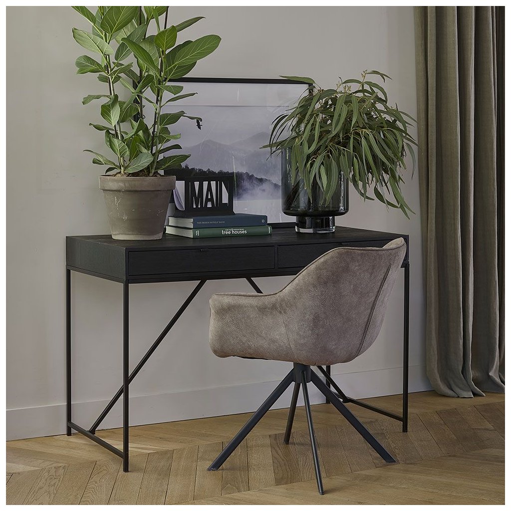 Bobby je skvělý stůl pro vaši domácí kancelář. Stůl má dvě téměř neviditelné zásuvky a je vyroben z tmavě mořeného dubového dřeva s tmavým kovovým rámem a decentními moderními úchytkami.Tato série zahrnuje několik kusů nábytku.
