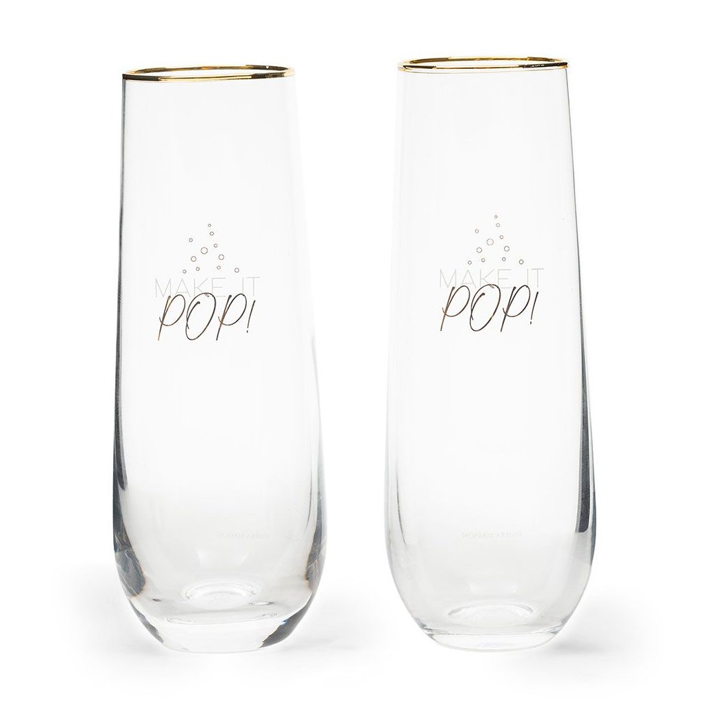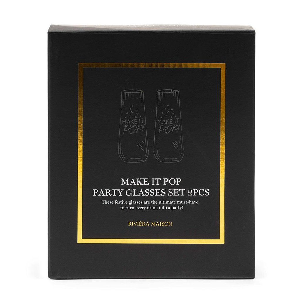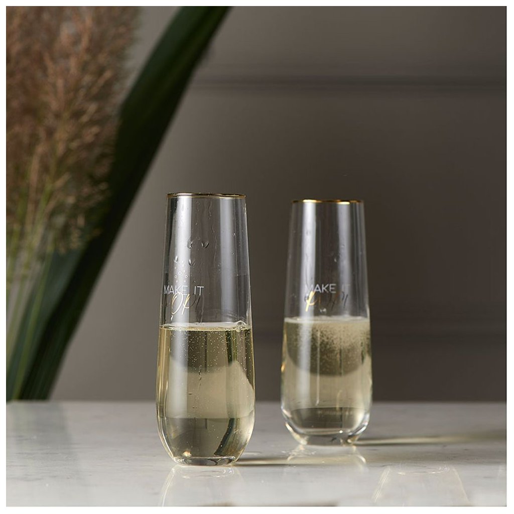 Jedná se o sadu dvou sklenic na šampaňské bez podstavce. Vysoká bublinková sklenice se nahoře zužuje a je zakončena zlatým okrajem. Sklenice je opatřena slavnostním textem "Make It Pop!". Make it pop! Elegantní sklenice jsou dodávány v krásné dárkové krabičce.Doplňkové parametry