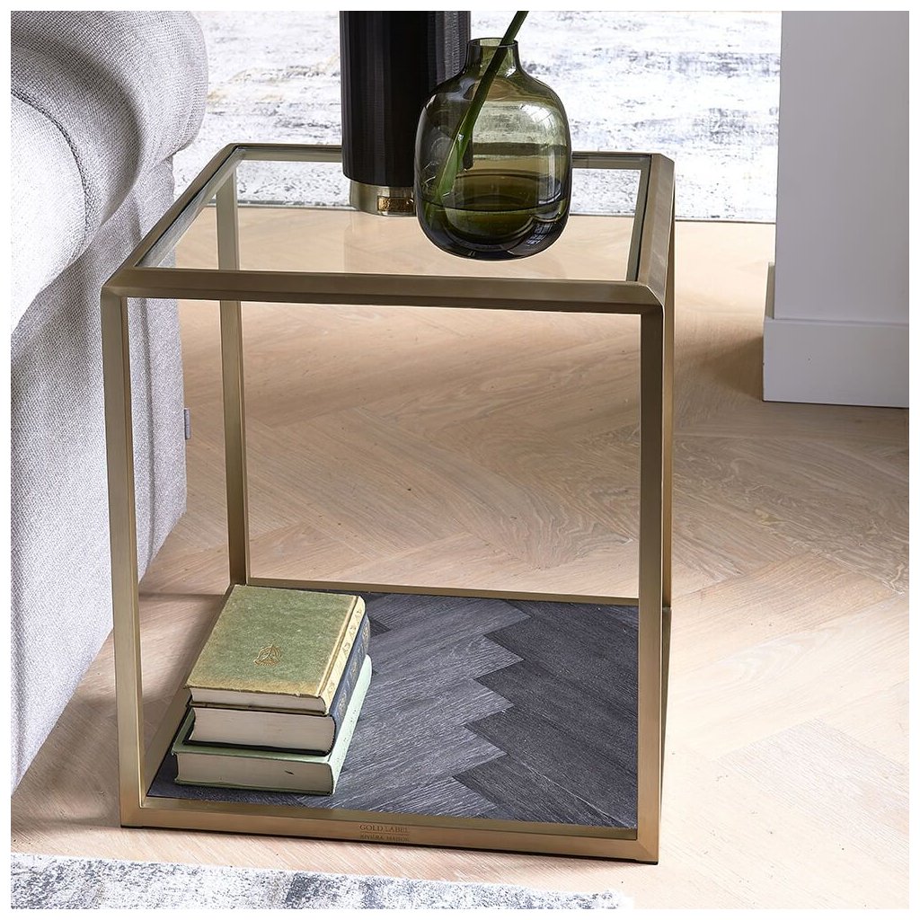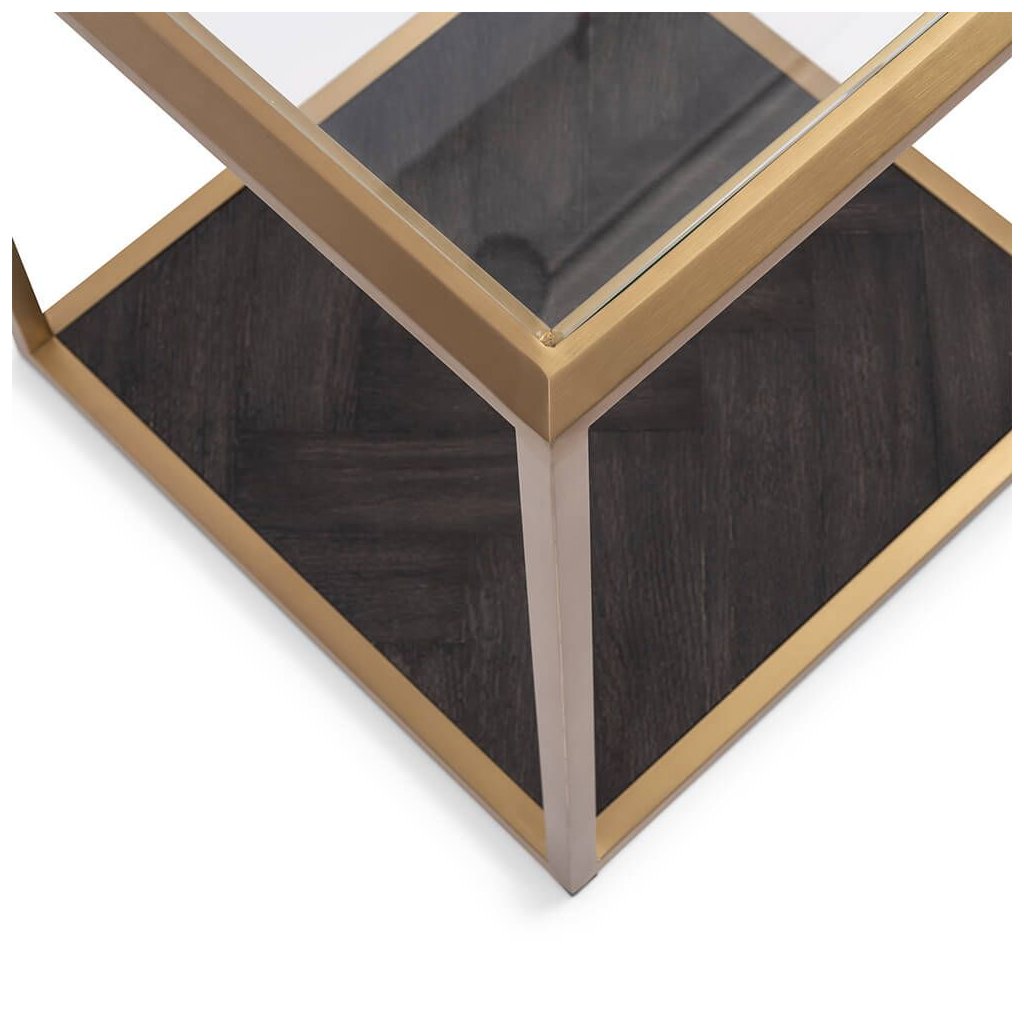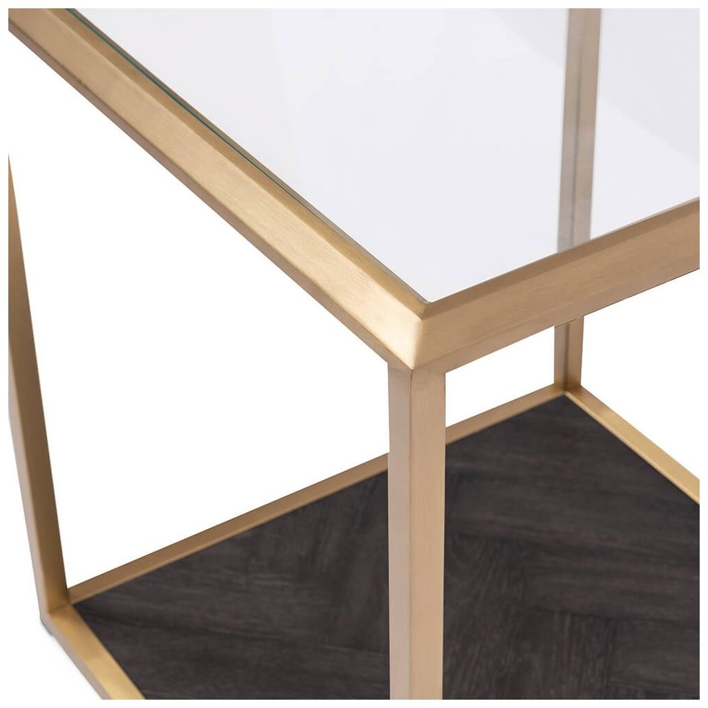 Tento elegantní odkládací stolek je vyroben z nerezové oceli v módní zlaté barvě. Deska z tvrzeného skla spočívá na ocelovém rámu. Spodní část odkládacího stolku je vyrobena z černohnědého dubu s vykládaným vzorem. Součástí řady Stanton je také jídelní stůl.
