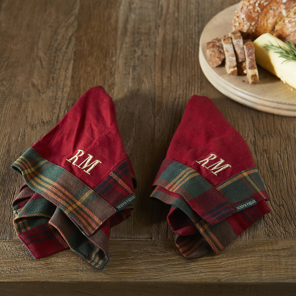 Objevte tyto krásné červené bavlněné ubrousky s tartanovým lemem a logem RM elegantně vyšitým zlatou barvou. Dodají vašemu prostřenému stolu nádech tradice a útulnosti, ideální pro zvláštní příležitosti. Sada 2 kusů