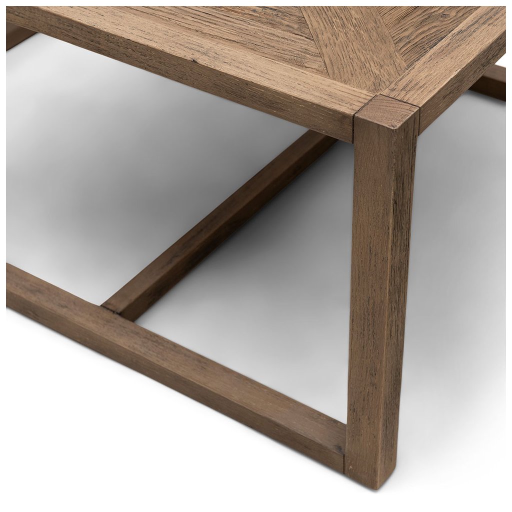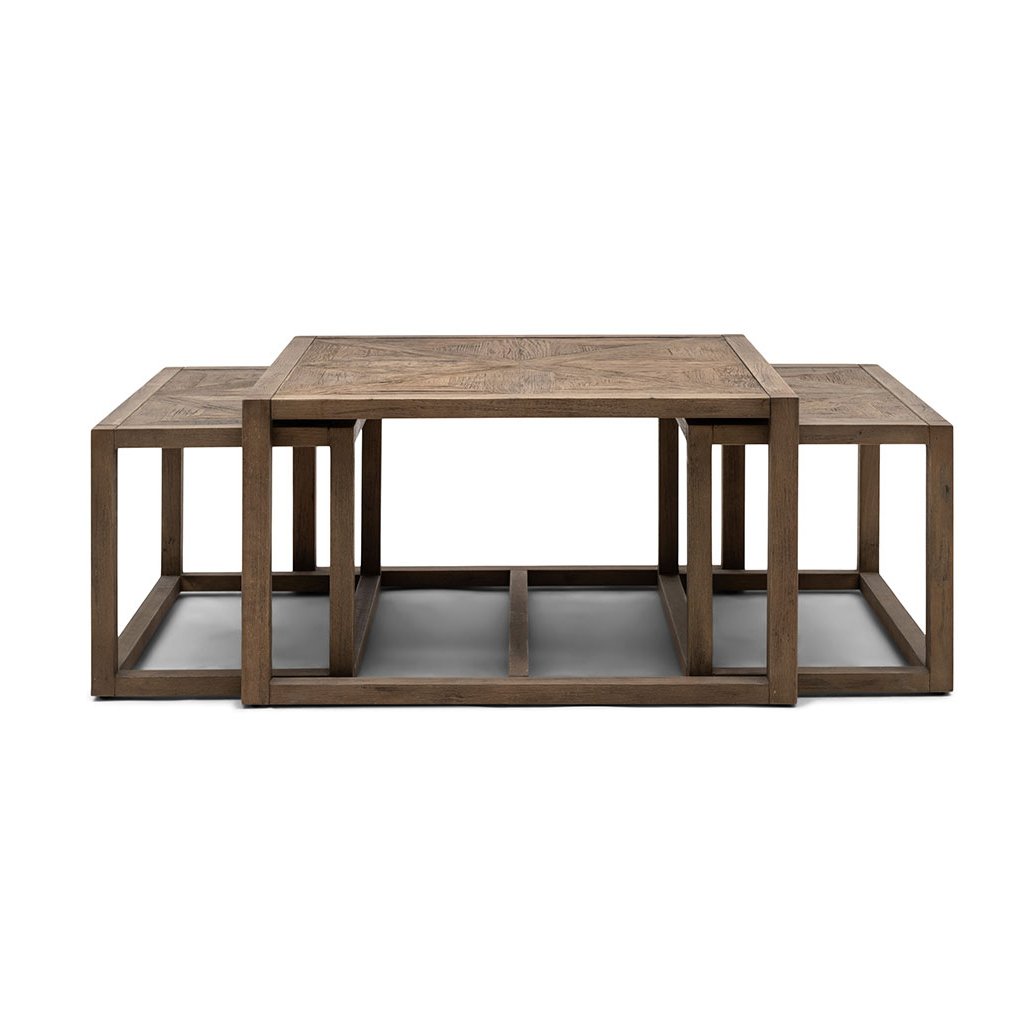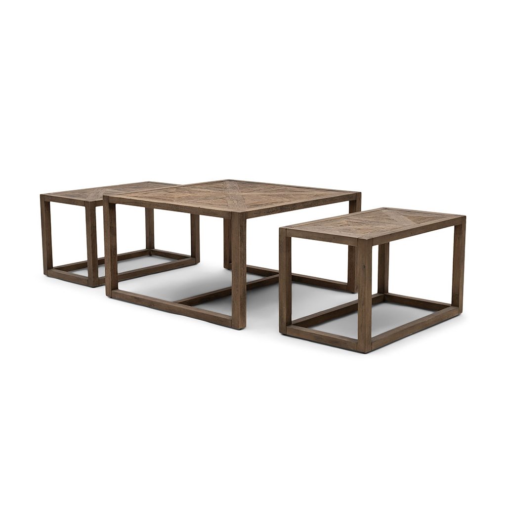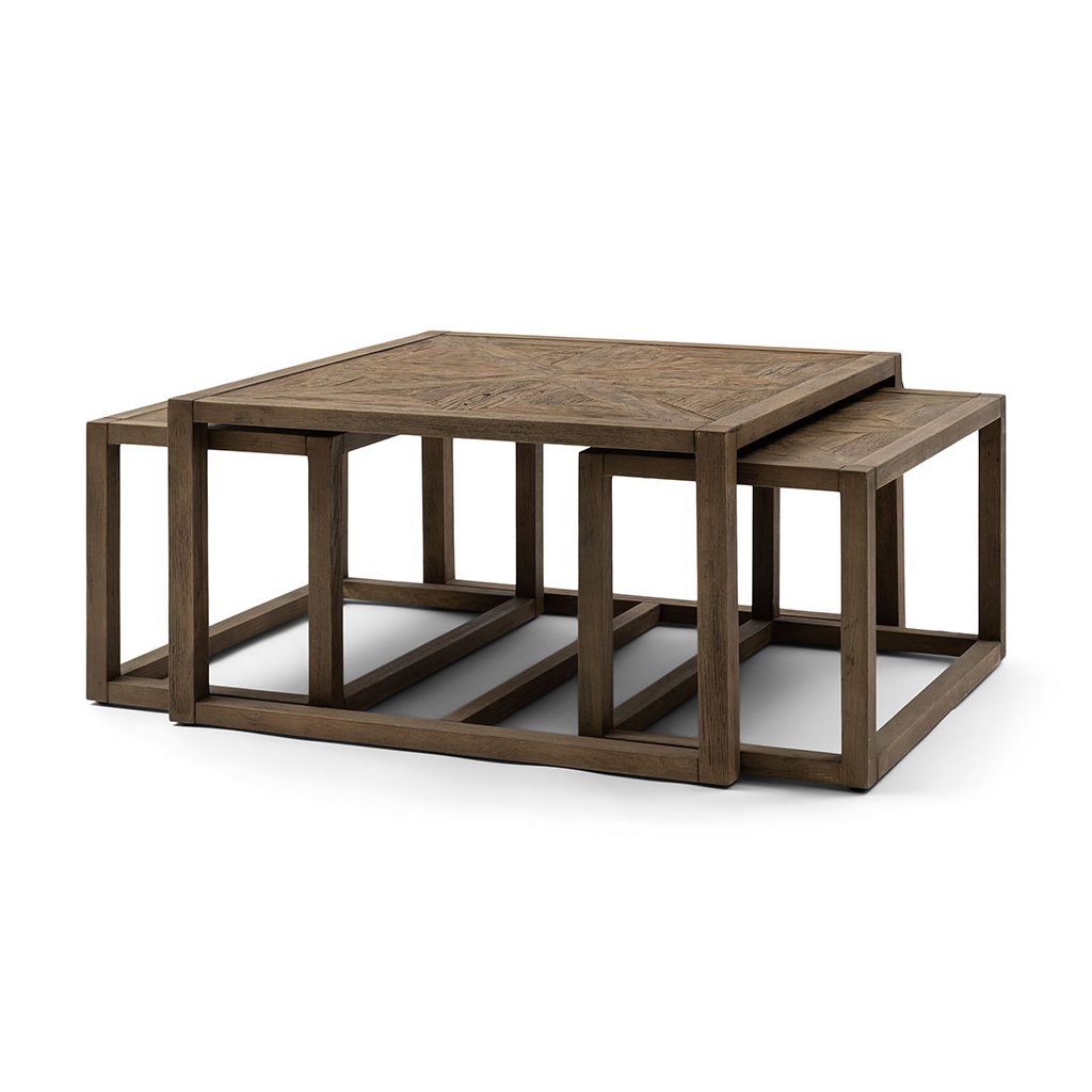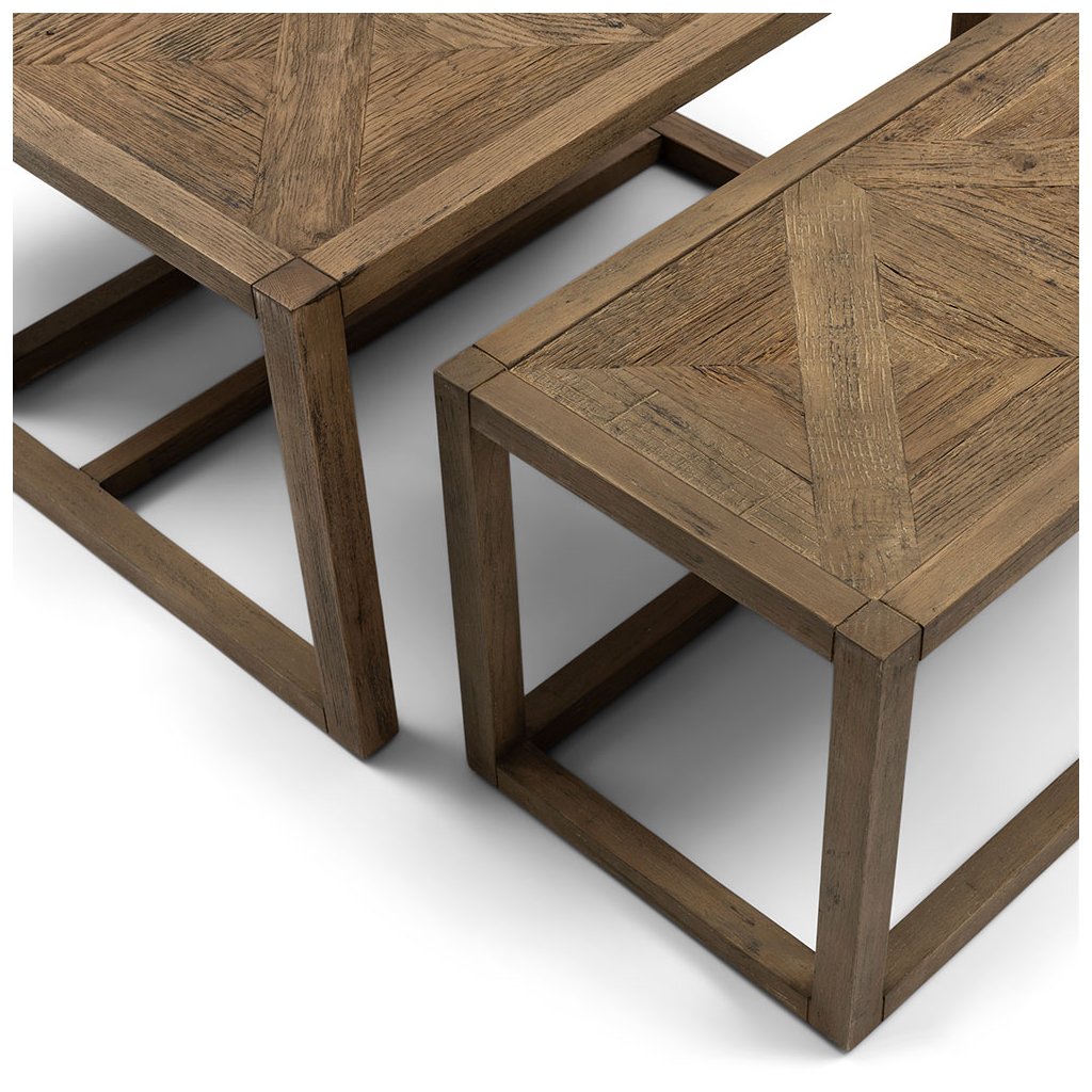Kolekce Romora Bay zahrnuje tuto sadu tří konferenčních stolků. Největší konferenční stolek má čtvercový tvar o rozměrech 80 × 80 cm, zatímco menší stolky se dokonale vejdou pod tento velký stolek. Tato sada konferenčních stolků je určena pro společné i individuální použití, což vám dává možnost vytvořit si vlastní požadované uspořádání. Tato sada stolků, vyrobená ze stařeného jilmového dřeva a s rafinovaným vzorem rybí kosti, vyzařuje elegantní atmosféru.