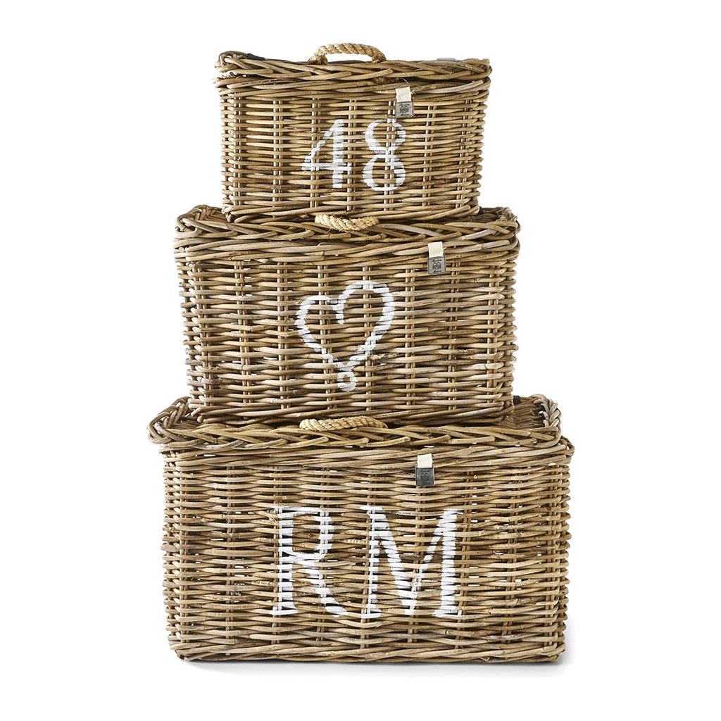 Ručně pletená a ručně malovaná sada ratanových košů sestávající ze tří košů různých velikostí. Koše se dodávají v sadách po třech kusech. Praktická organizační pomůcka pro ukládání oblečení a textilu nebo například časopisů a fotografií.