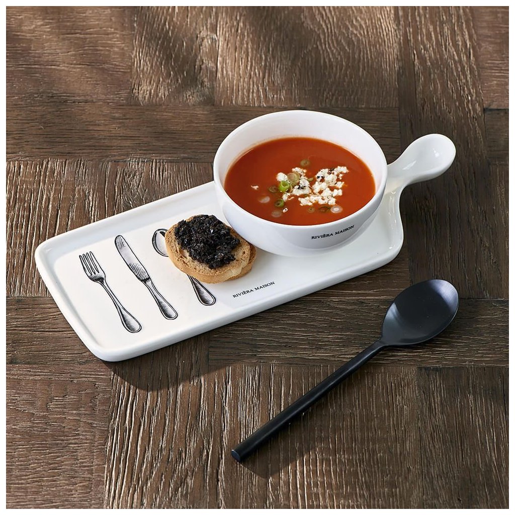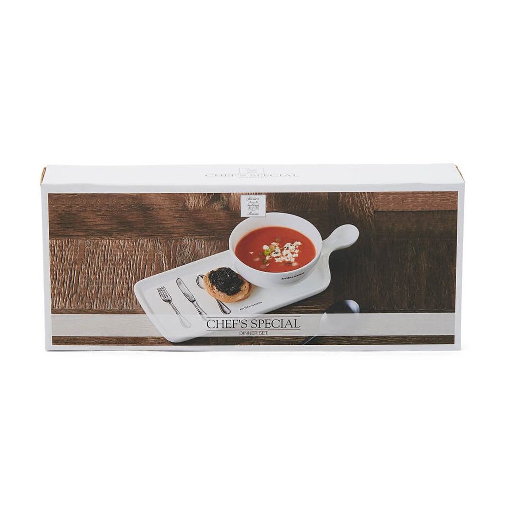 Sada Chef's Special Dinner Set je servírovací podnos s bílou porcelánovou miskou. Ideální na snídani nebo polévku s chlebem. Sada je 29,5 cm dlouhá a 12 cm široká a dodává se v dárkové krabičce. Tác je zdoben ručně malovaným nožem, vidličkou a lžící.Doplňkové parametry