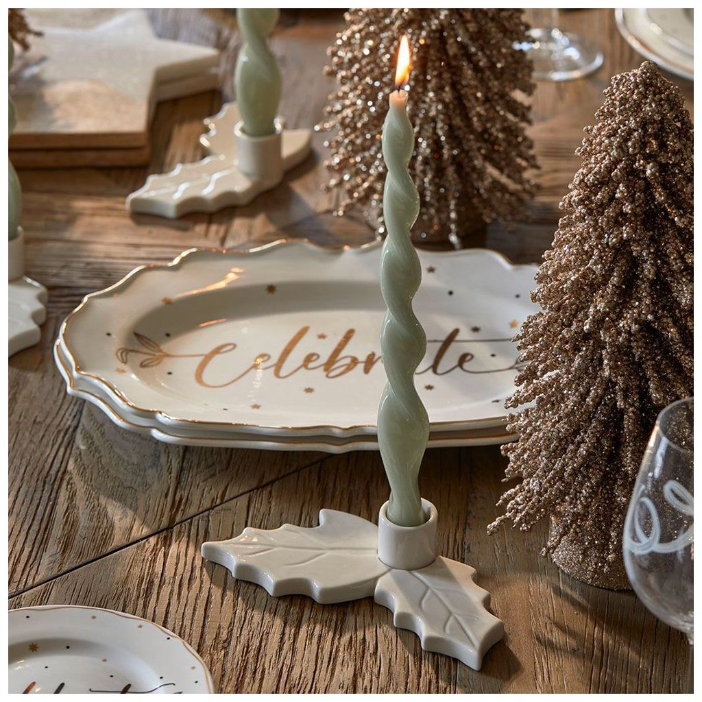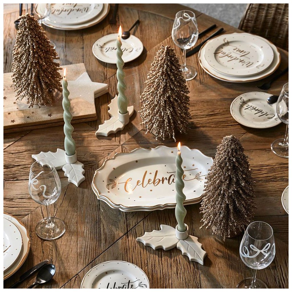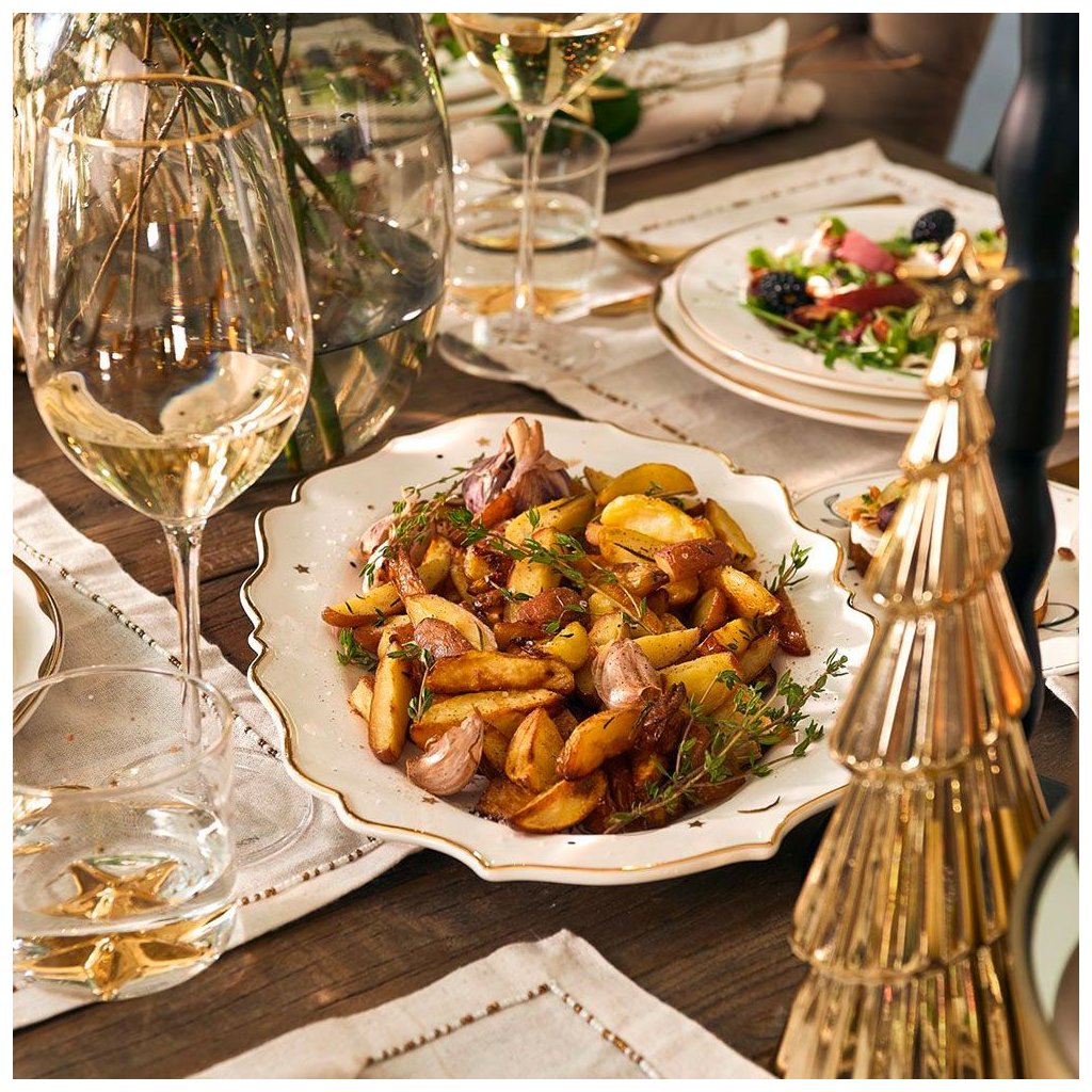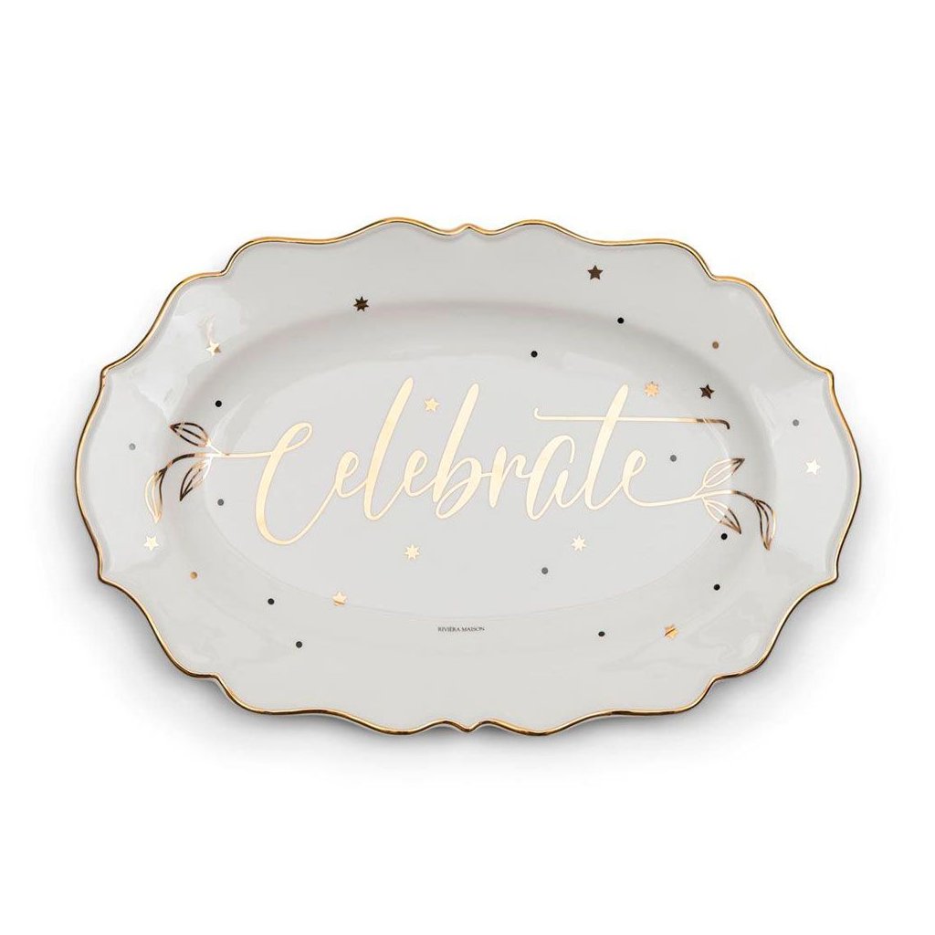 Jídlo na oslavu můžete samozřejmě servírovat na tomto talíři ze série Celebrate. Bílý porcelán s vroubkovaným okrajem, zdobený zlatými nápisy a hvězdičkami. Na okraji je také zlatá linka.