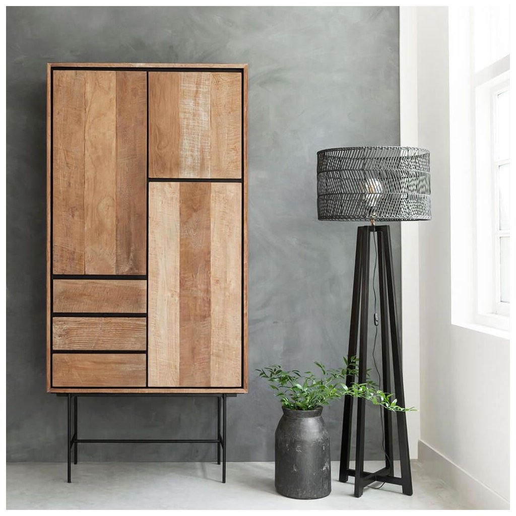Kulaté kovové rámy ladí se starým dřevem, stejně jako černý interiér skříněk. Asymetrická dvířka bez úchytek působí celkovým dojmem sofistikované elegance.