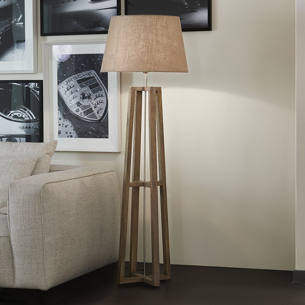Vysoká stojací lampa se čtyřmi dřevěnými nohami, která má rustikální a zároveň elegantní vzhled. Tato lampa vyzařuje teplo, zejména díky pěknému stínidlu, a dodá okouzlující akcent každému interiéru. Lampa je vybavena praktickým tlačítkem pro snadné ovládání.Doplňkové parametry