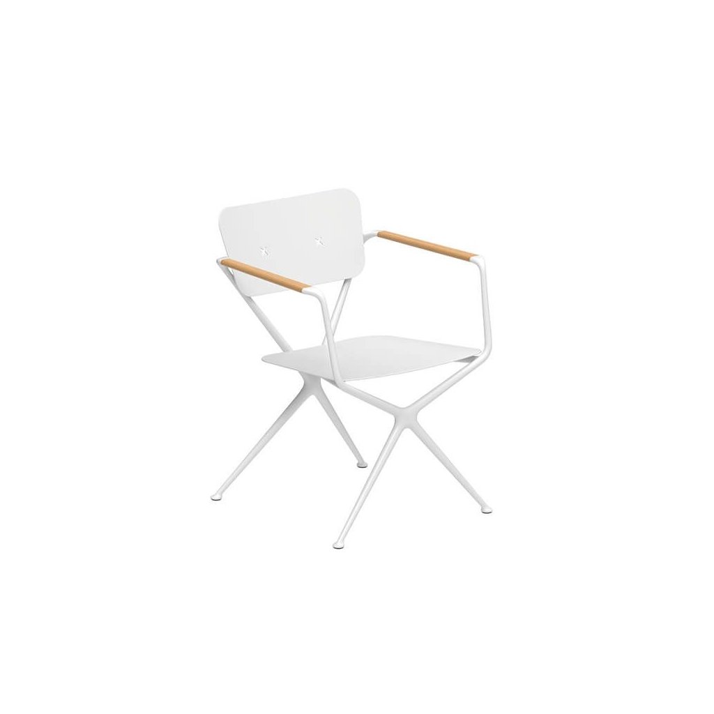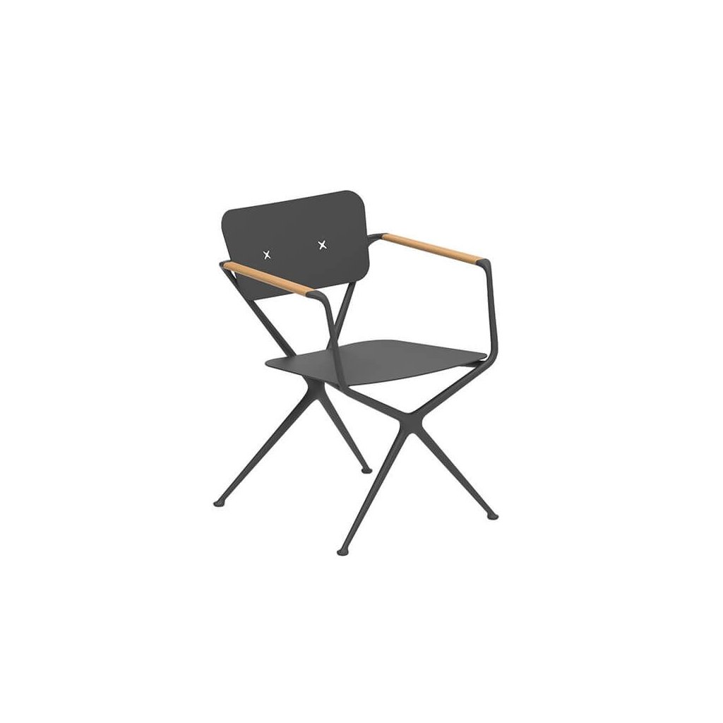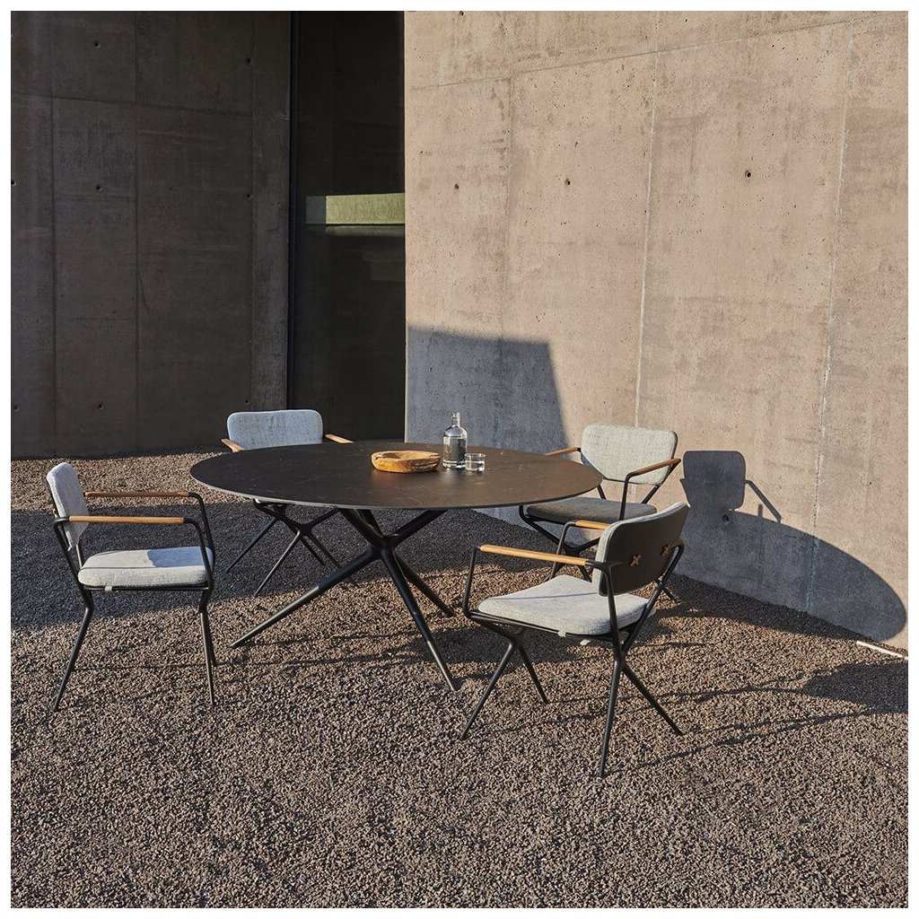 Jaký lepší název vymyslet pro židli ze dvou rámů ve tvaru písmene X, která nabízí více pohodlí a stylu než ... Ex!Hladké organické linie rámu z litého hliníku přerušují pouze zkosené područky z teakového dřeva, které jsou hřejivým designovým prvkem. Bezproblémová integrovaná zakřivená deska opěradla má dva otvory ve tvaru písmene X. Slouží nejen jako estetický prvek, ale také jako upevňovací body pro polštář opěradla. Připevňují se pomocí knoflíků ve tvaru X, které mají standardní barvu rámu. Jako volitelné příslušenství jsou nabízeny také tykové, které lze sladit s područkami. Ty činí židli Exes ještě atraktivnější.
