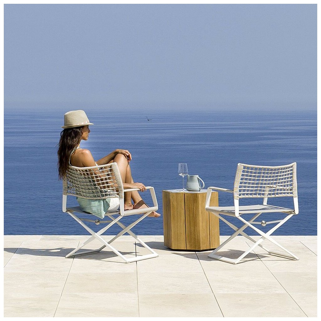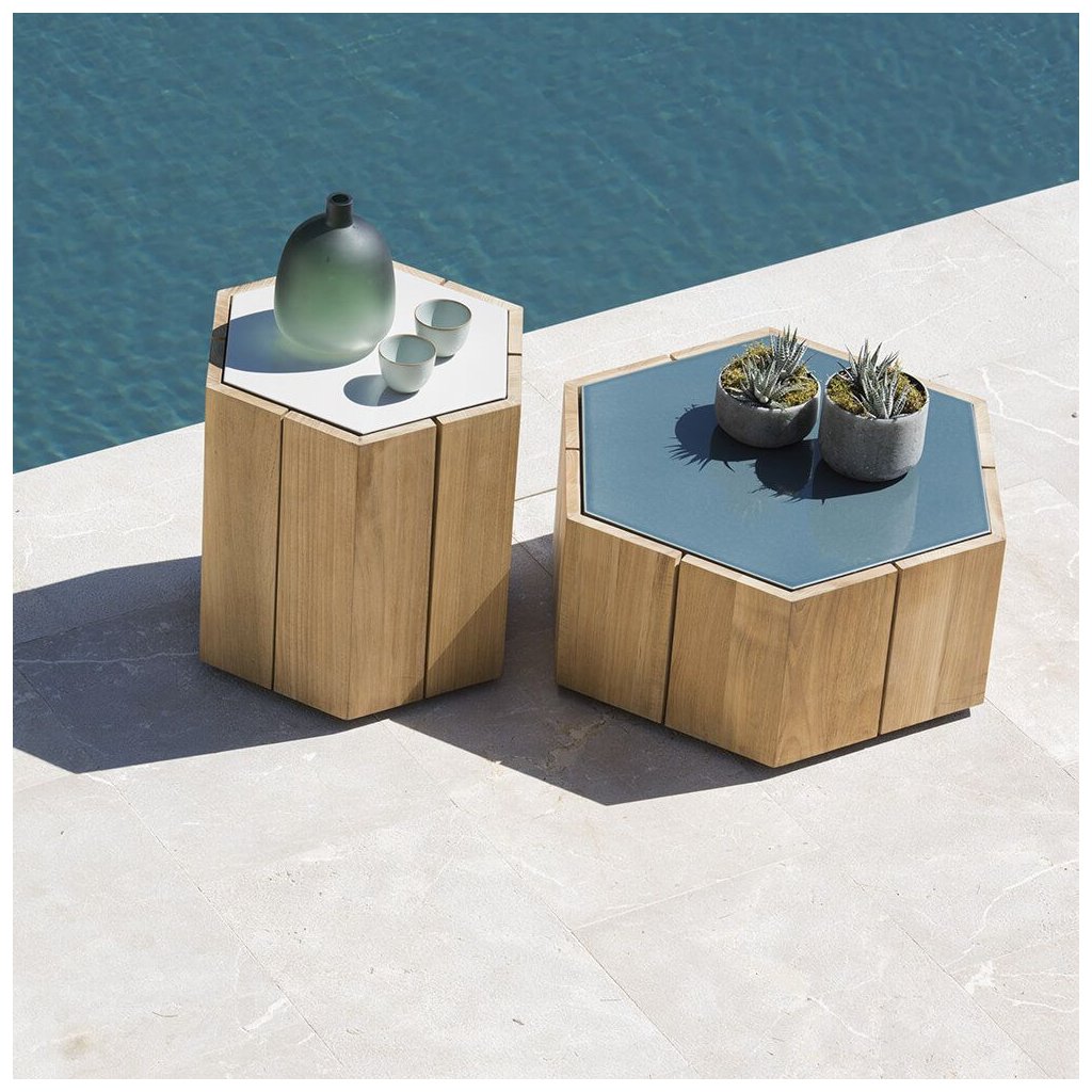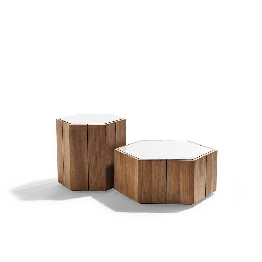 Tyto teakové stoly lze objednat ve dvou velikostech 69x31 cm a 50x49 cm.