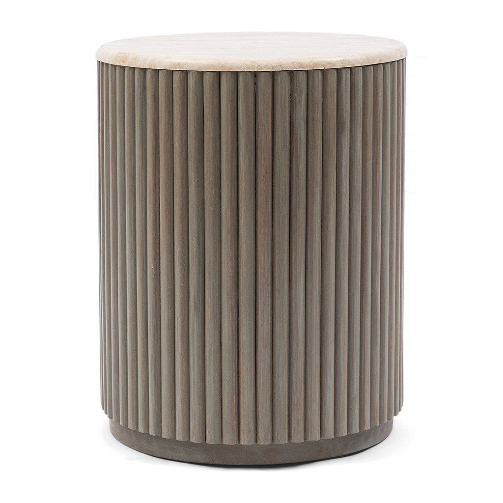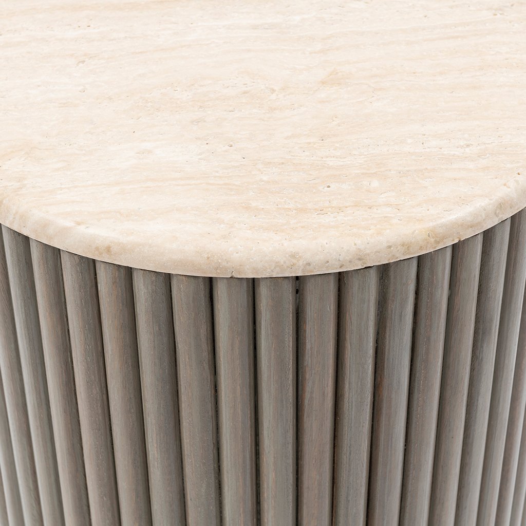 Dodejte svému obývacímu pokoji moderní vzhled s postranním stolkem Villanova. Jedinečný travertinový postranní stolek dodá vašemu prostoru přirozený a sofistikovaný dojem, přičemž každý kus má svůj vlastní charakter. Teplé přírodní tóny vytvářejí příjemnou atmosféru. Nohy stolku jsou vyrobeny z mangového dřeva a mají elegantní intarzii z dřevěných proužků, což jim dodává další styl a sofistikovanost.Doplňkové parametry