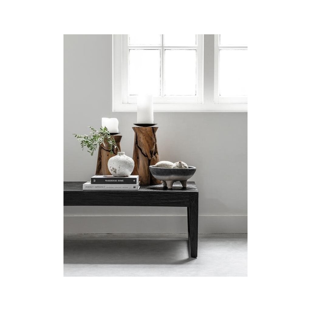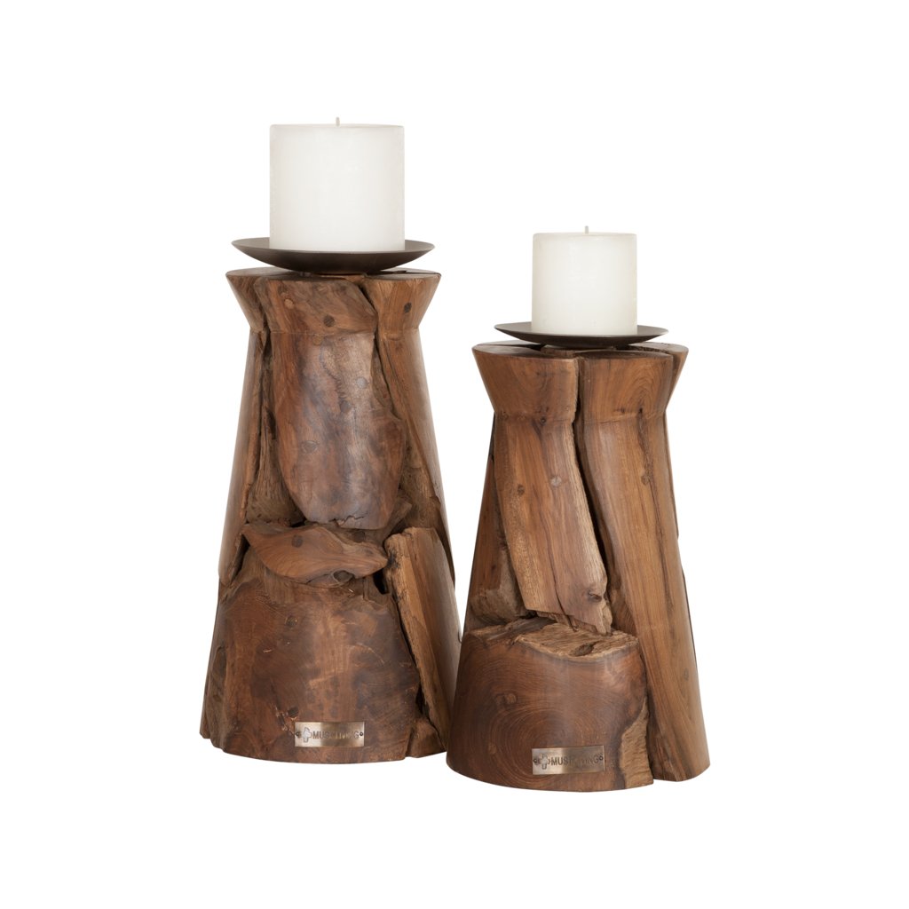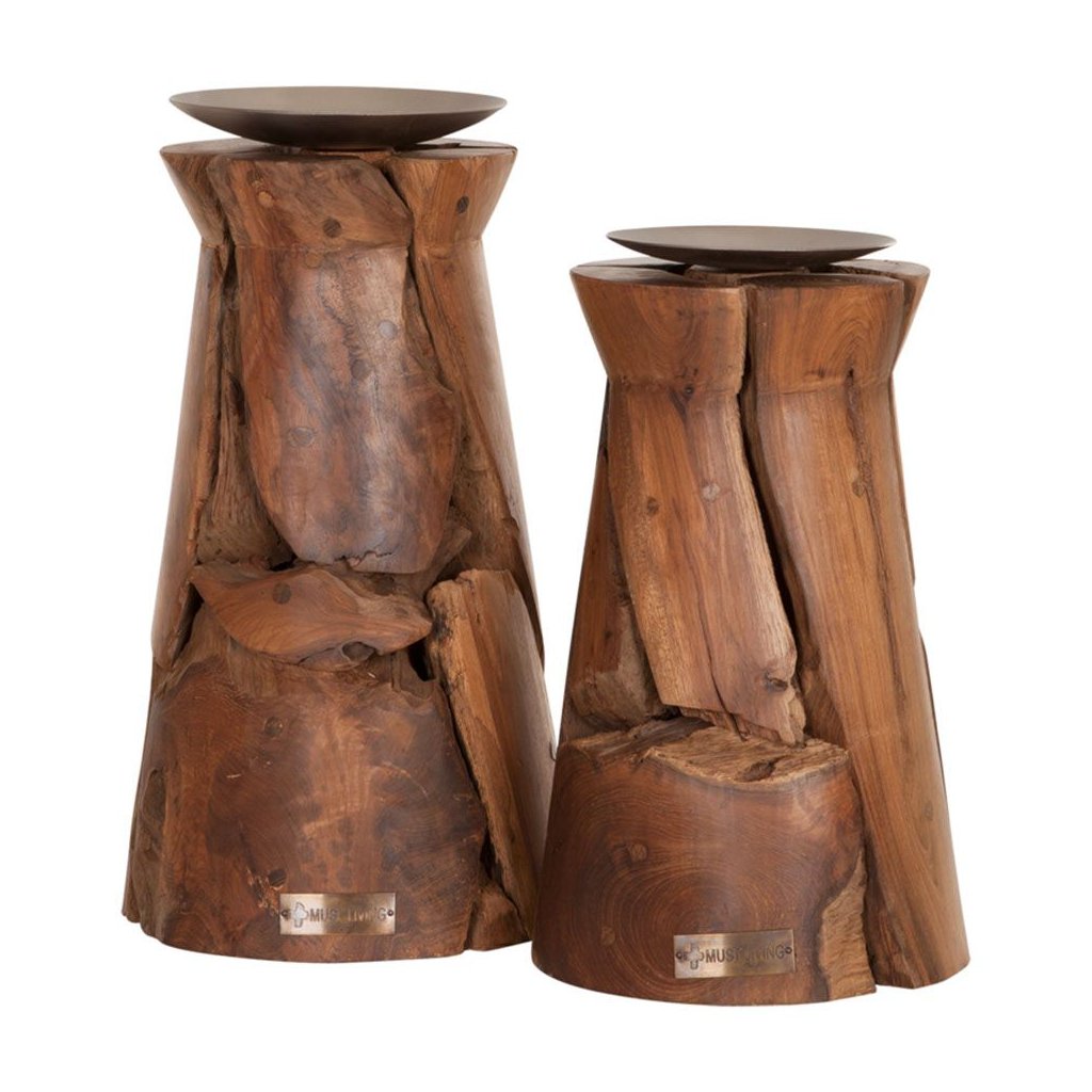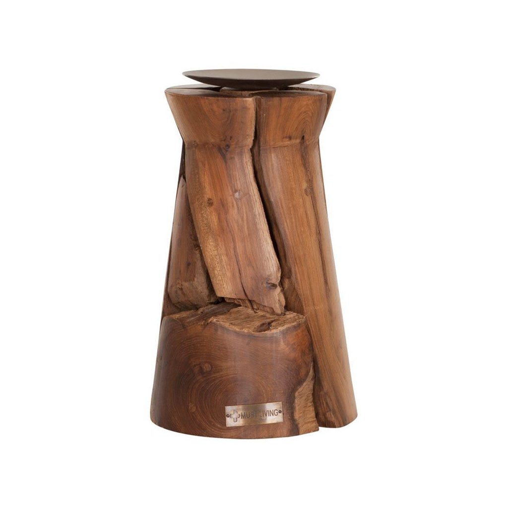 Atypický svícen z recyklovaného teakového dřeva. Vzhledem k ruční výrobě a použití unikátních dřevěných odřezků je každý svícen jedinečný, rozměry jsou přibližné.