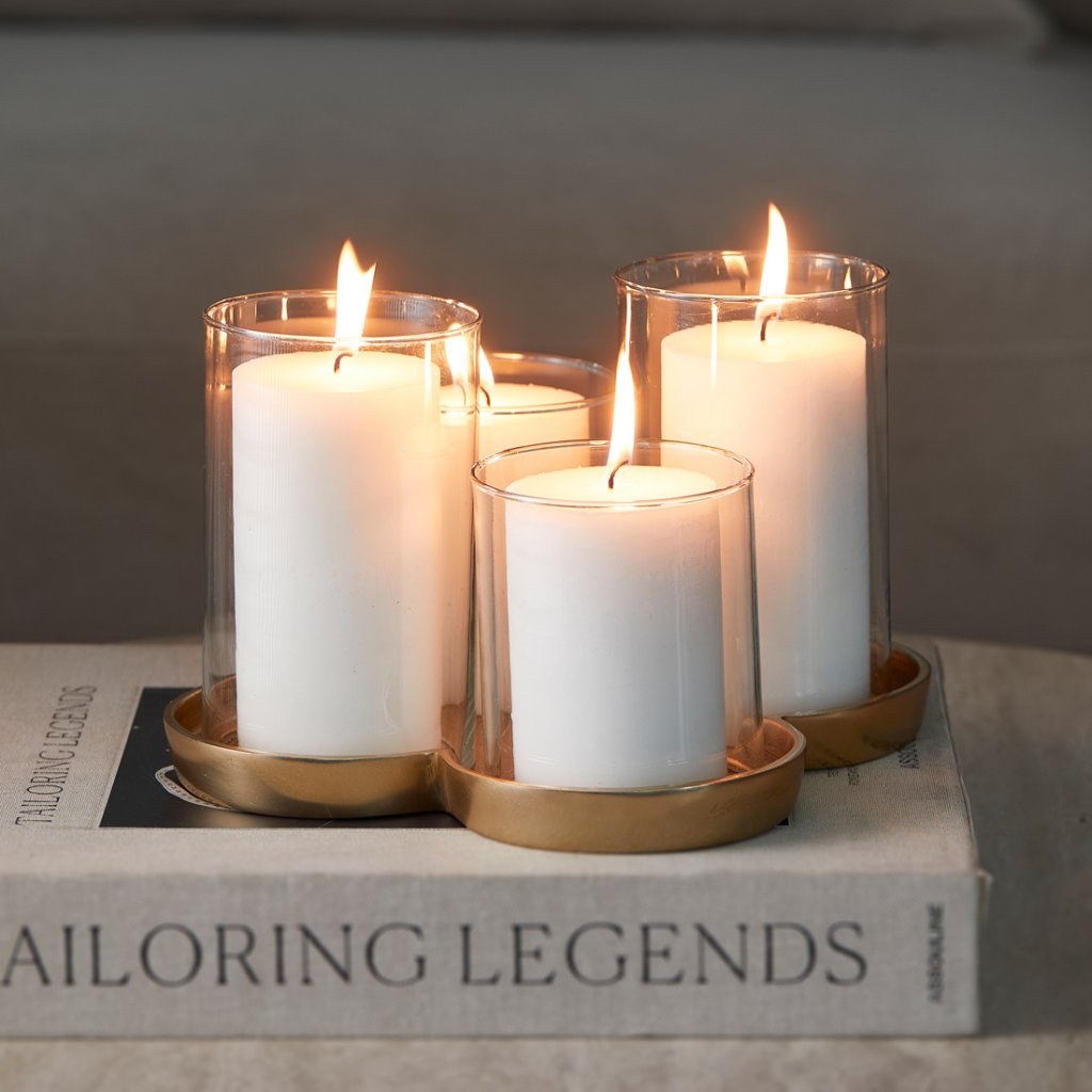 Větrná lampa Lionas je elegantním a atmosférickým doplňkem vašeho interiéru. Zlatý podnos působí luxusním dojmem, zatímco čtyři skleněné trubice krásně odrážejí světlo a šíří hřejivou záři. Tato větrná lampa vytváří sofistikovanou atmosféru, která je ideální pro romantickou večeři i útulný večer doma. Kombinace elegance a funkčnosti z ní činí výrazný kousek do každé místnosti. Dodejte svému interiéru nádech půvabu s touto stylovou větrnou lampou.Doplňkové parametry
