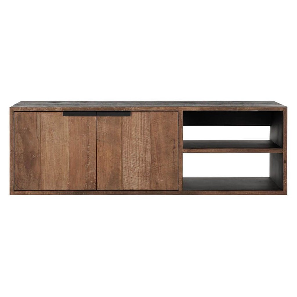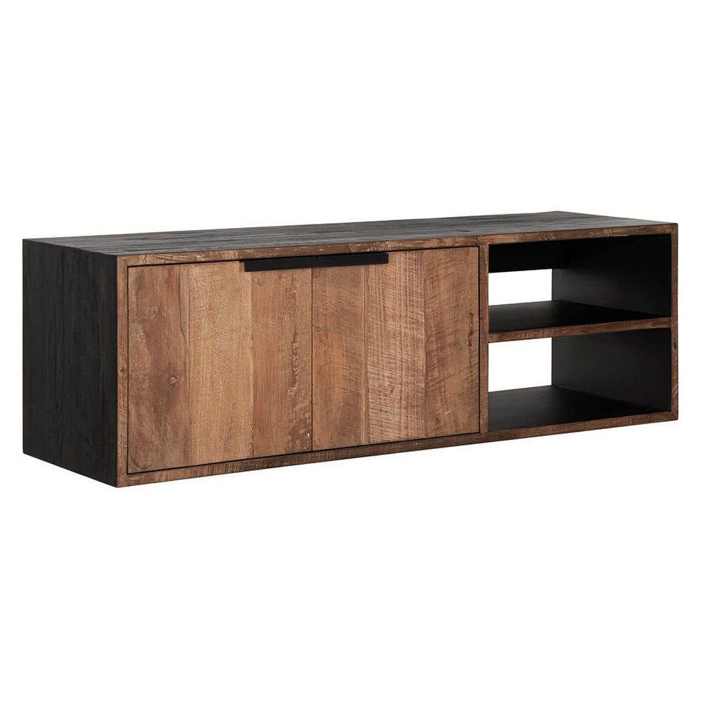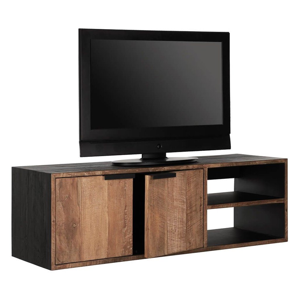 Malý závěsný televizní stolek Cosmo No.1 kombinuje přírodní a černé recyklované teakové dřevo a vytváří tak výraznou a industriální kombinaci.Stůl je vybaven 2 plnými dvířky pro uložení všeho, co nemá být vidět, a 2 otevřenými policemi na elektroniku.