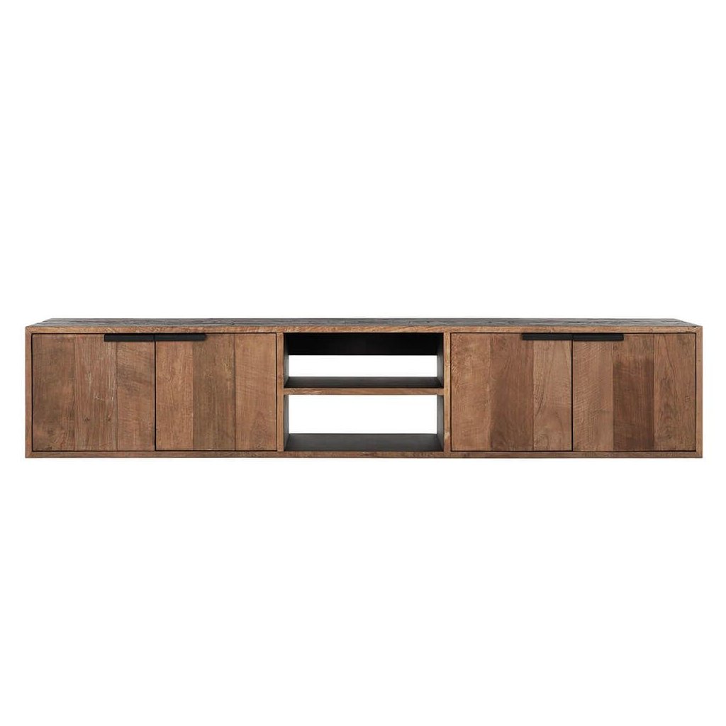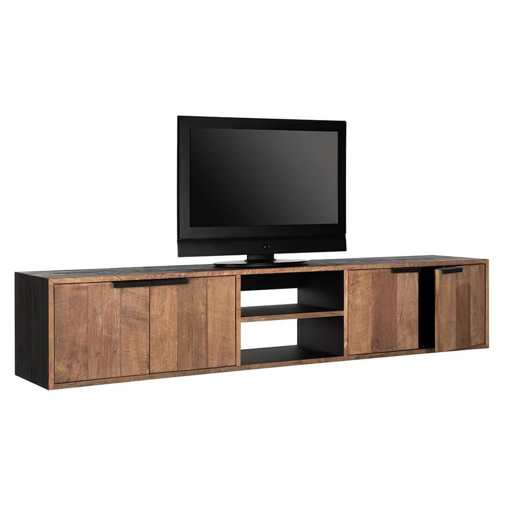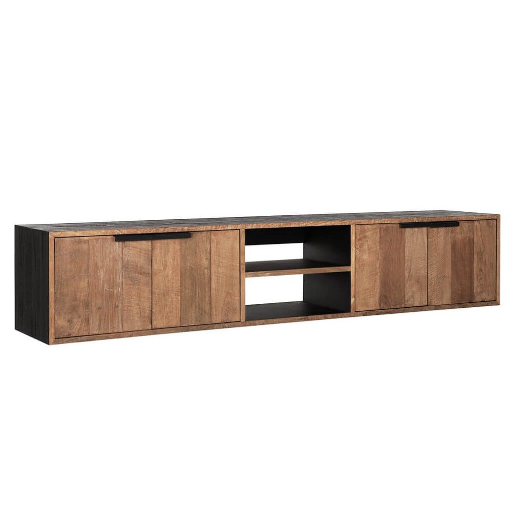 Velký závěsný televizní stolek Cosmo No. 1 kombinuje přírodní a černé recyklované teakové dřevo a vytváří tak výraznou a industriální kombinaci.Stůl je vybaven 4 plnými dvířky pro uložení všeho, co nemá být vidět, a 2 otevřenými policemi pro elektroniku.