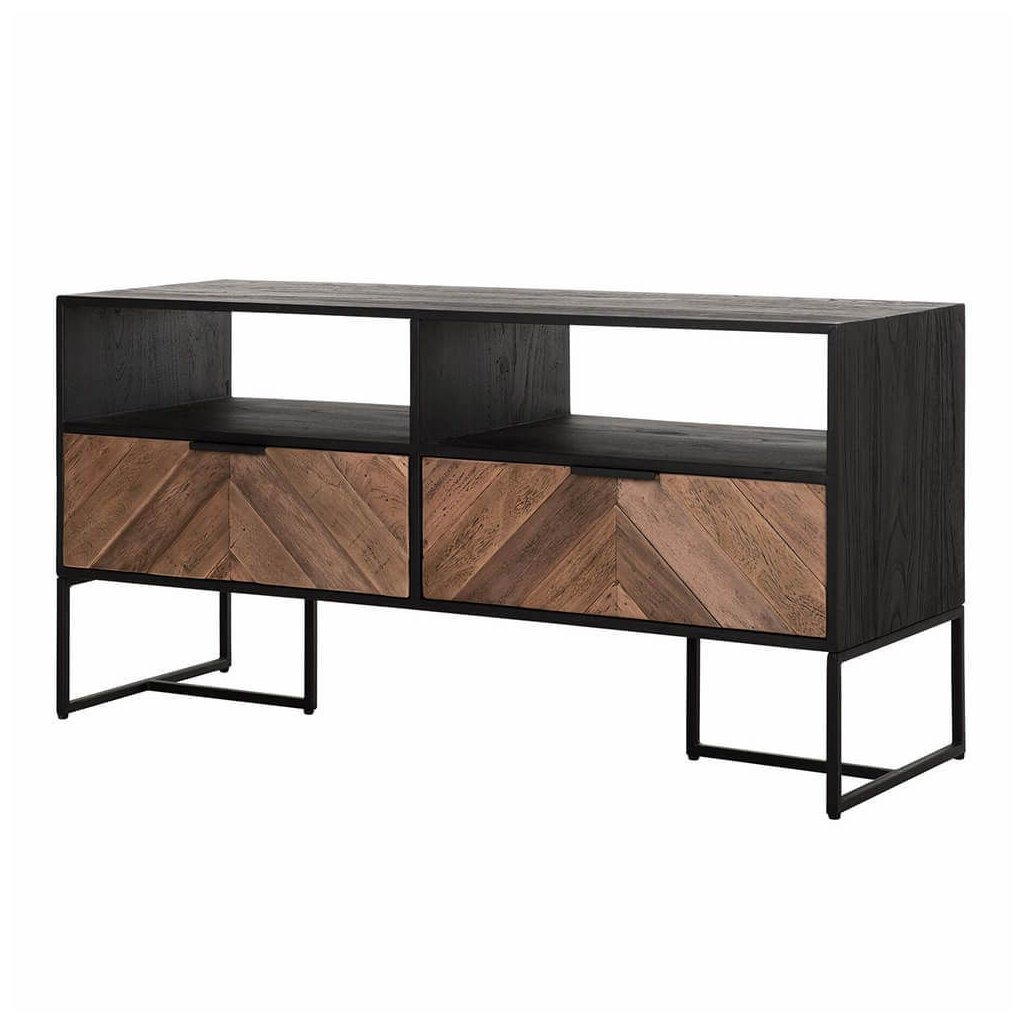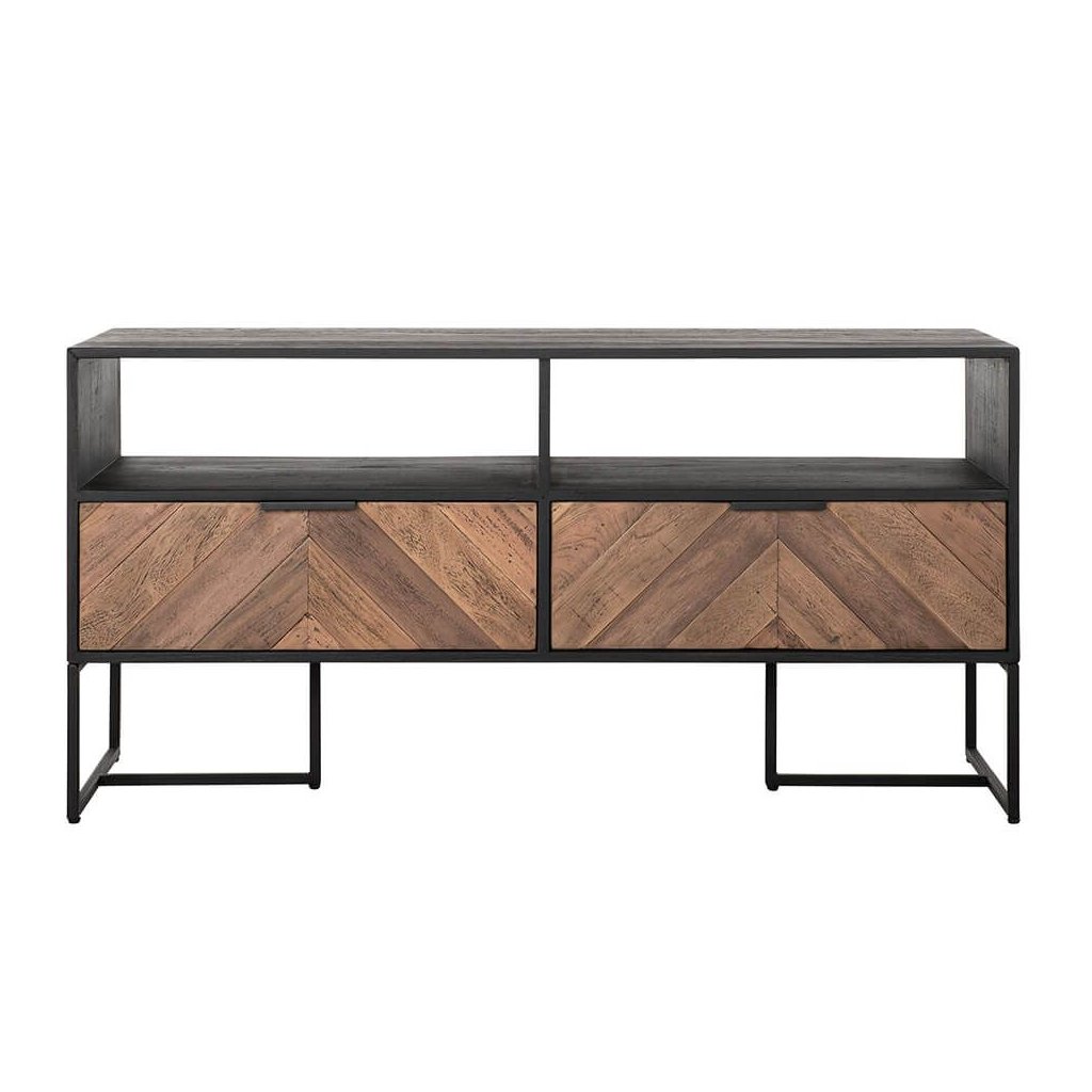 Tato krásná televizní skříňka má vzor rybí kosti a robustní ocelové detaily. Skříňka Criss Cross má 2 zásuvky a 2 otevřené police a měří 60x120x40 cm. Hravé nožičky jsou závěrečnou tečkou této skříňky.Nová řada výrazného nábytku s chevronovým vzorem z recyklovaného teakového dřeva. Kombinace šikmých pruhů a rovných linií je italskou podlahovou klasikou. Používá se na deskách stolů a dvířkách skříní, je hravý, atraktivní a elegantní. Jedná se o kolekci Criss Cross.