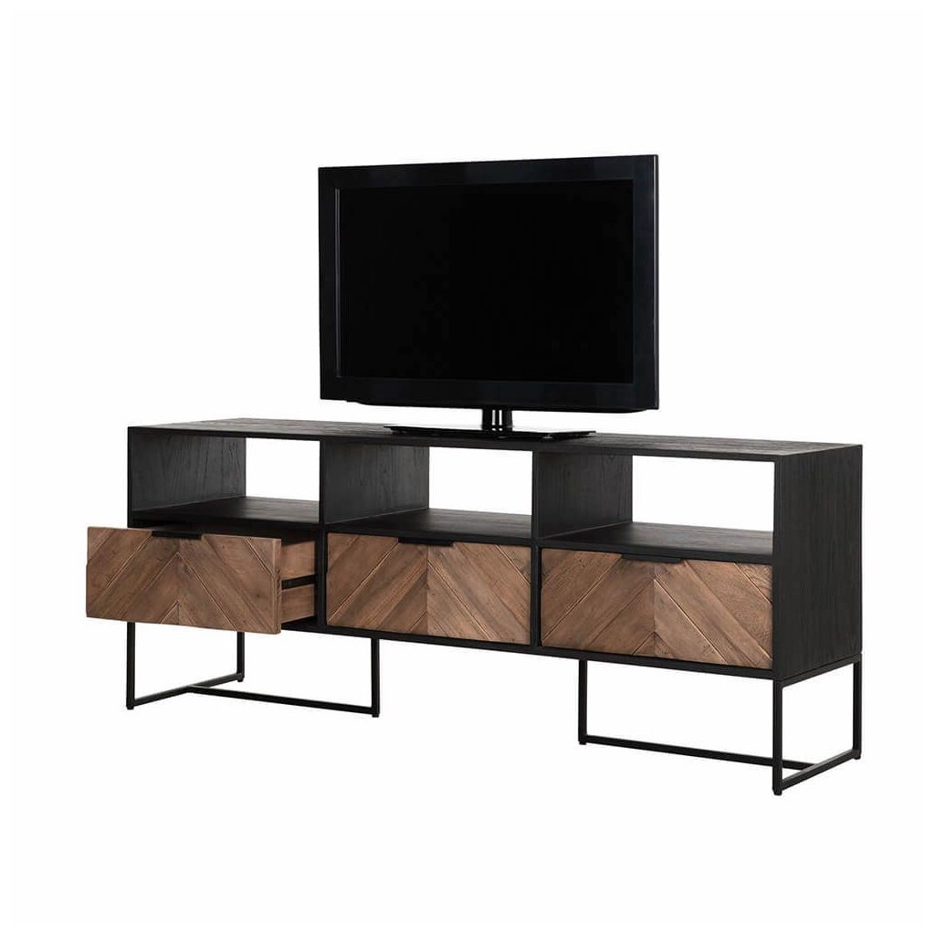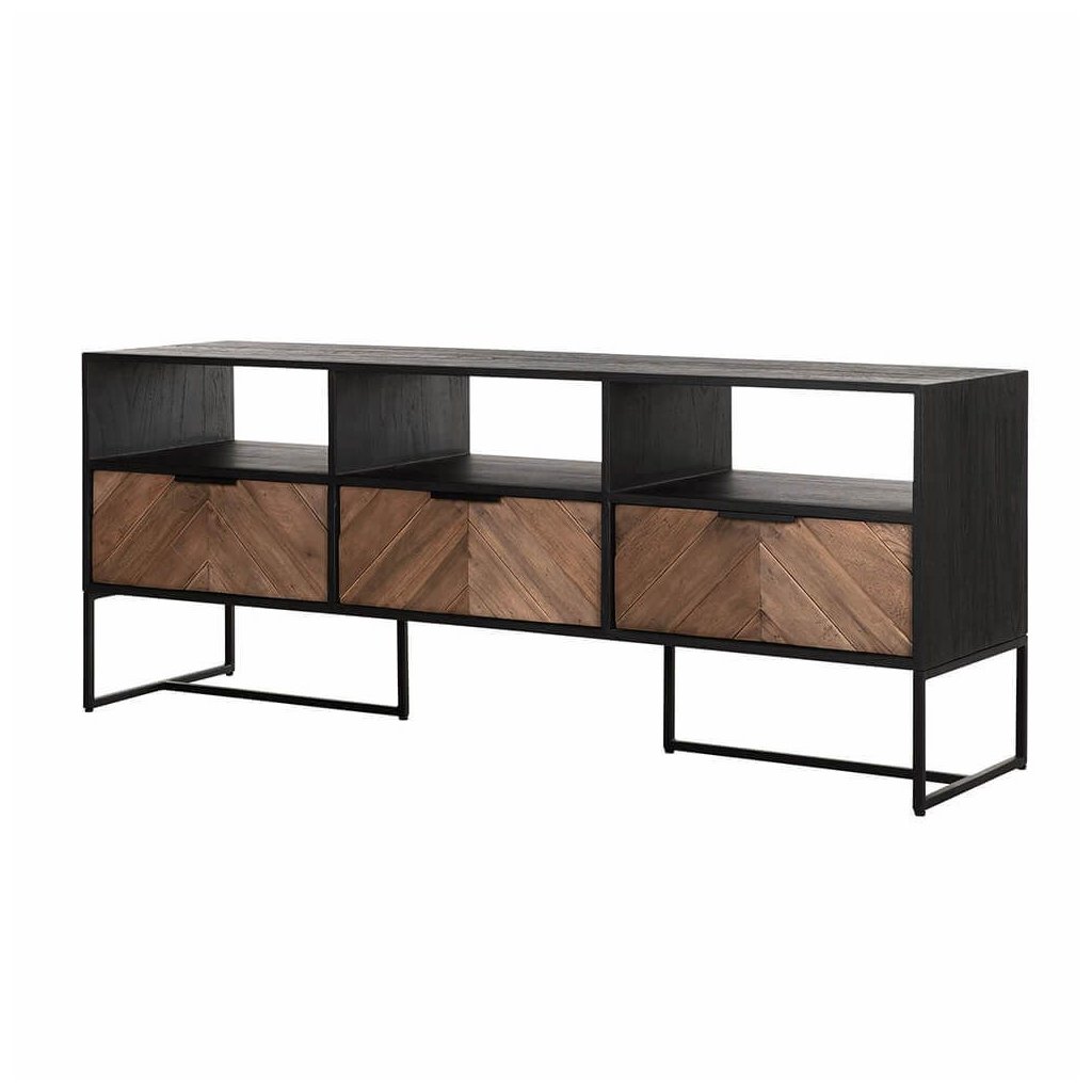 Tato krásná televizní skříňka má vzor rybí kosti a robustní ocelové detaily. Skříňka Criss Cross má 3 zásuvky a 3 otevřené police a měří 60x150x40 cm. Hravé nožičky jsou závěrečnou tečkou této skříňky.Nová řada výrazného nábytku s chevronovým vzorem z recyklovaného teakového dřeva. Kombinace šikmých pruhů a rovných linií je italskou podlahovou klasikou. Používá se na deskách stolů a dvířkách skříní, je hravý, atraktivní a elegantní. Jedná se o kolekci Criss Cross.