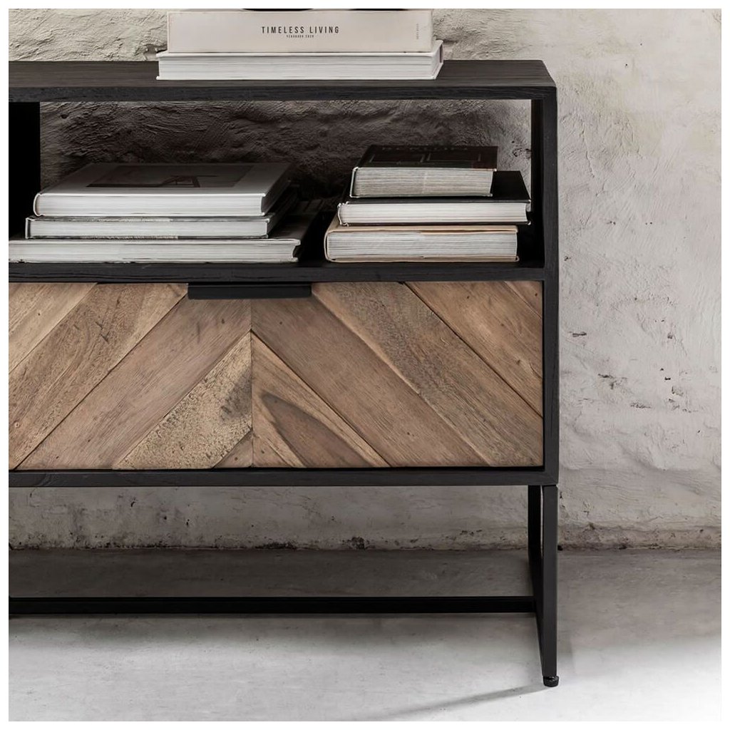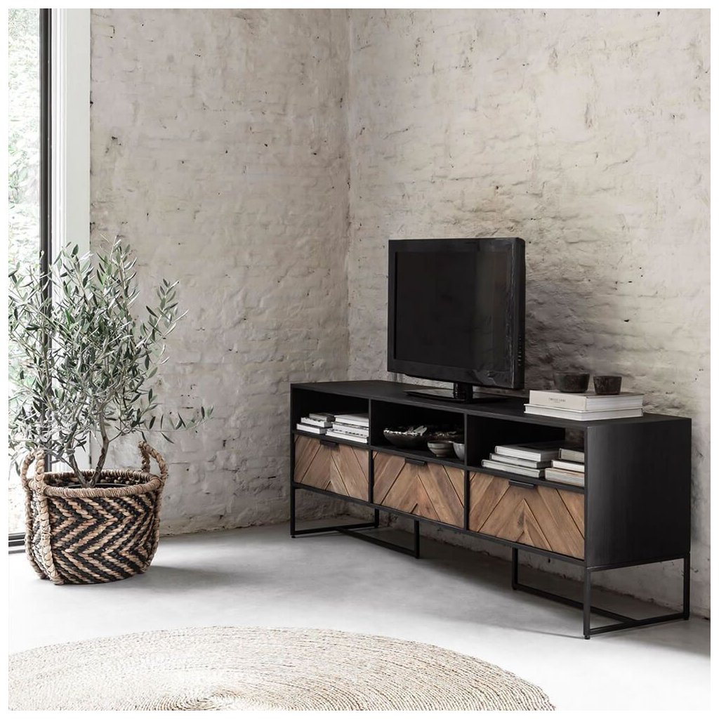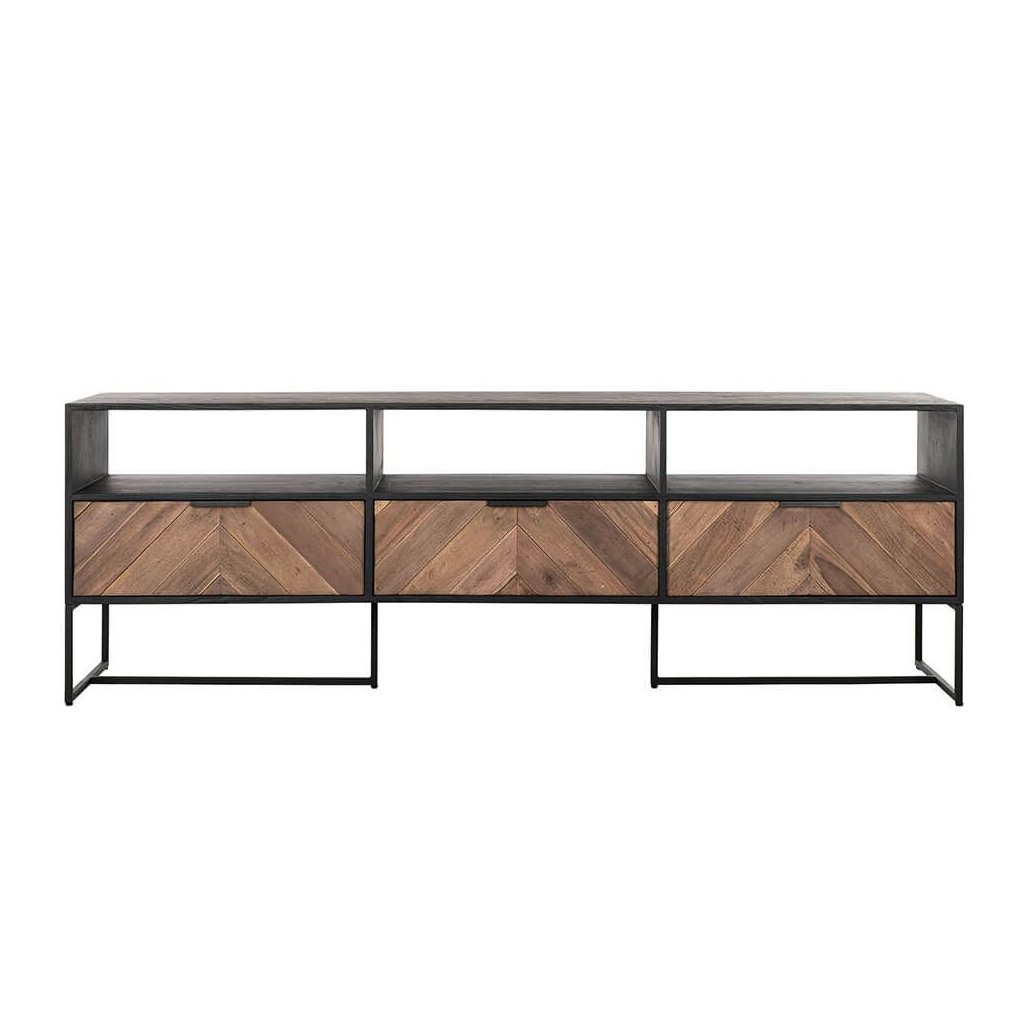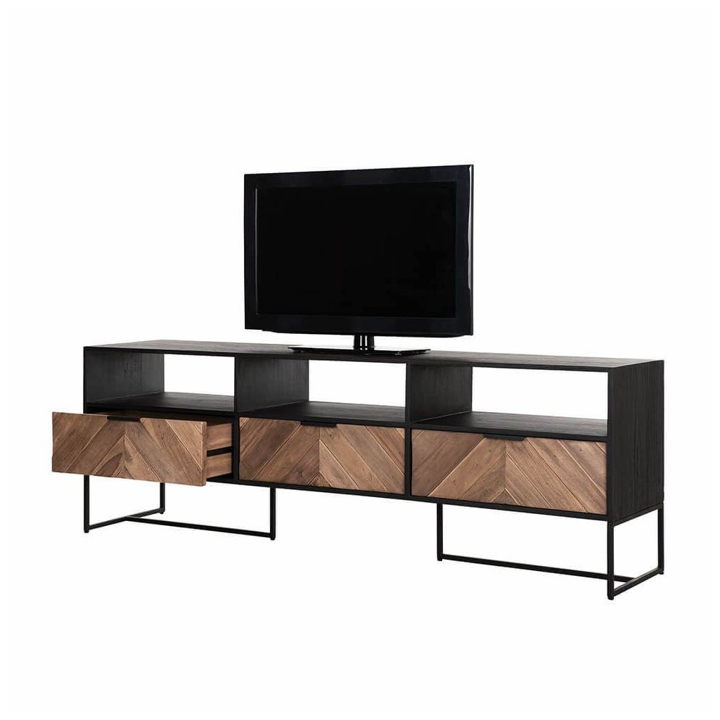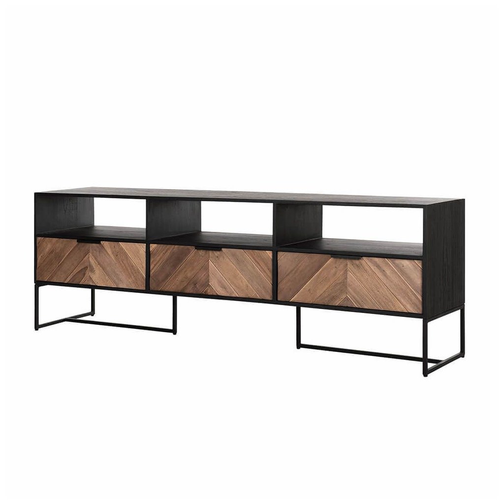Tato krásná televizní skříňka má vzor rybí kosti a robustní ocelové detaily. Skříňka Criss Cross má 3 zásuvky a 3 otevřené police a měří 60x180x40 cm. Hravé nožičky jsou závěrečnou tečkou této skříňky.Nová řada výrazného nábytku s chevronovým vzorem z recyklovaného teakového dřeva. Kombinace šikmých pruhů a rovných linií je italskou podlahovou klasikou. Používá se na deskách stolů a dvířkách skříní, je hravý, atraktivní a elegantní. Jedná se o kolekci Criss Cross.