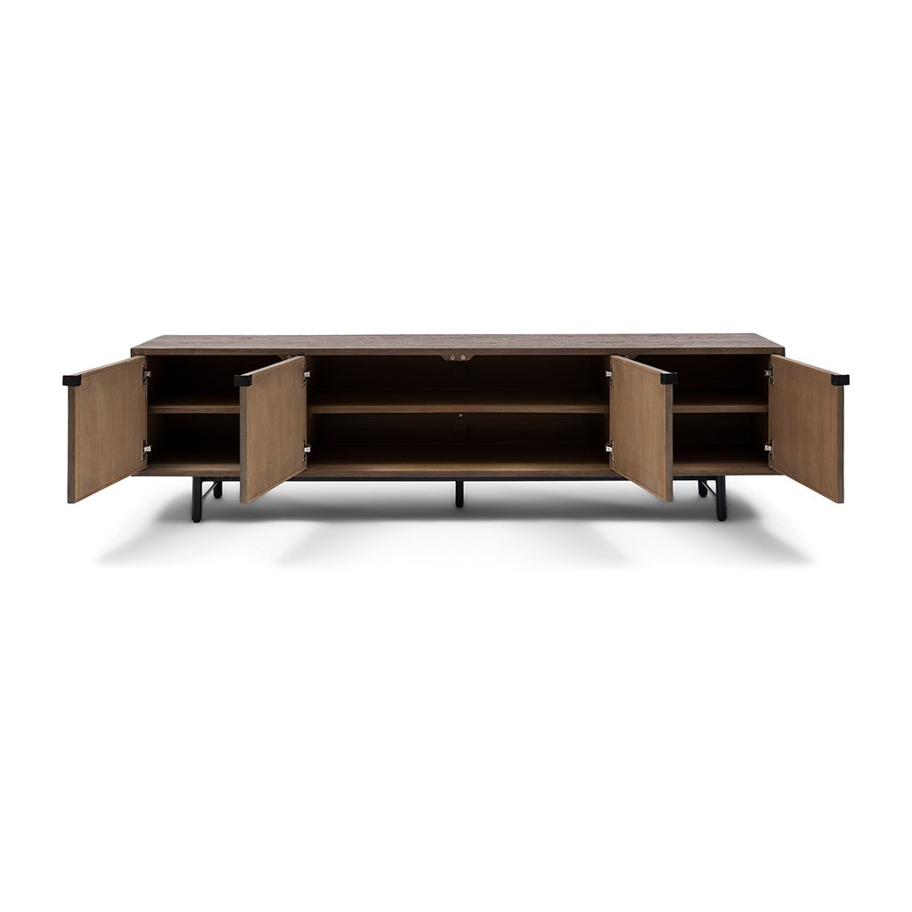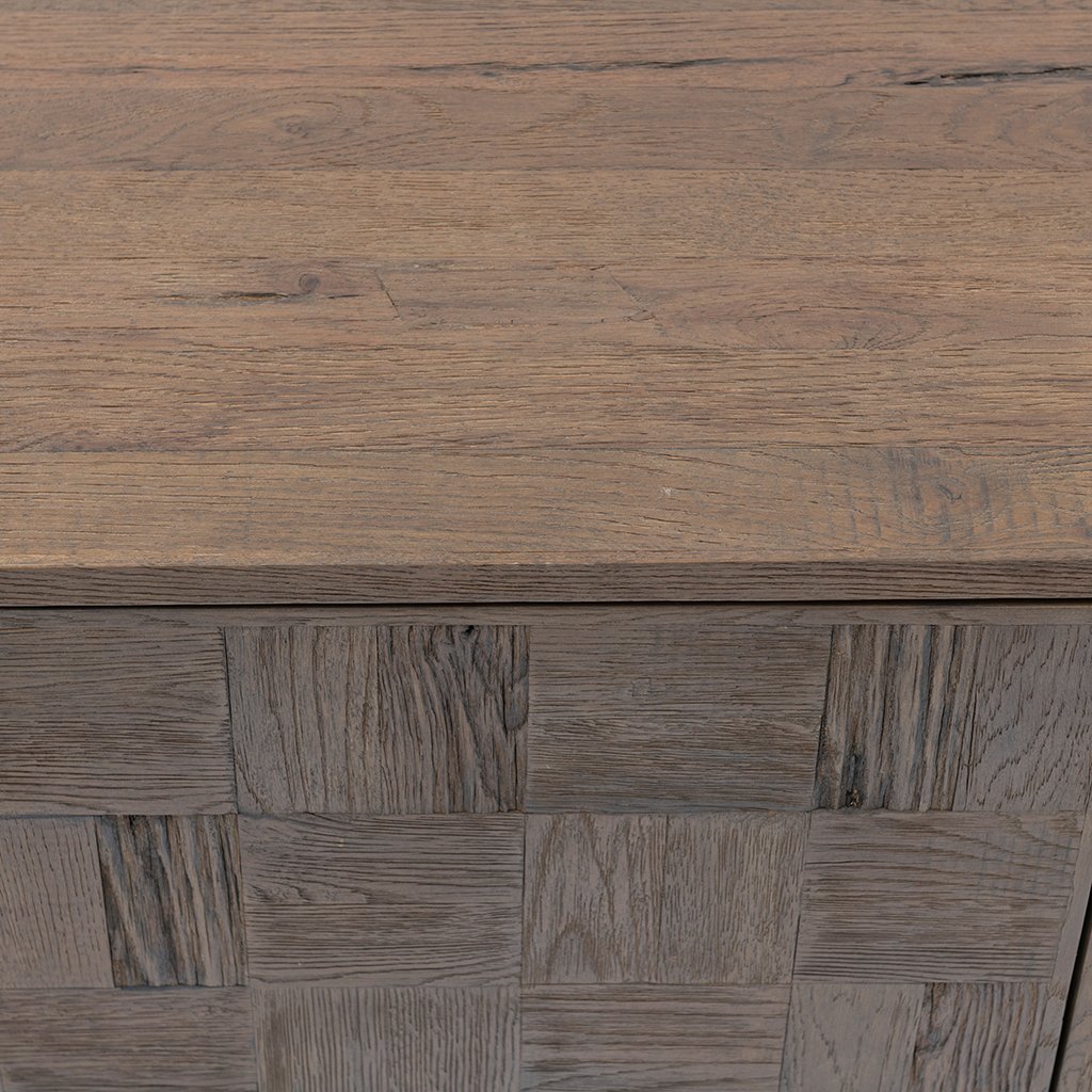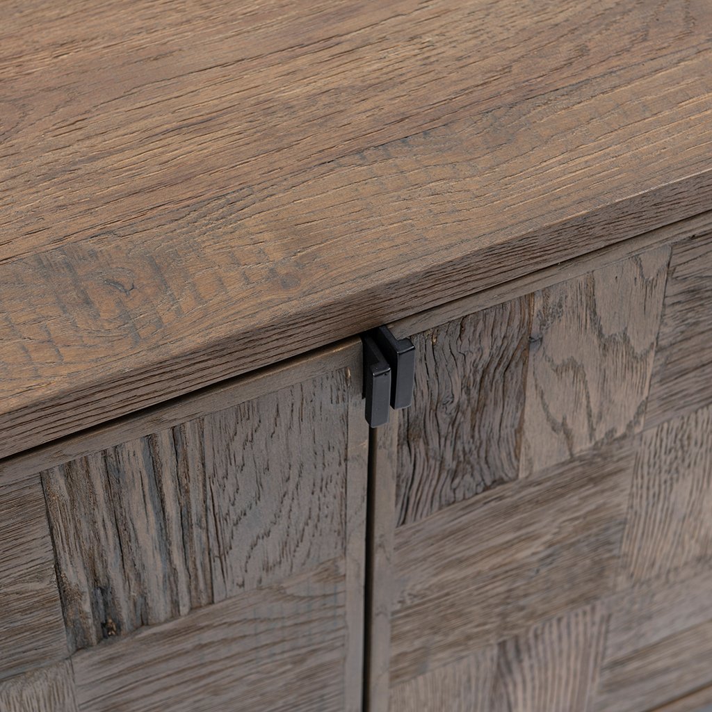 Televizní skříňka Mac Arthur v sobě spojuje pevnost a sofistikovaný vzhled. Skříňku podpírají štíhlé tmavé kovové nohy, které působí lehce a prostorně. Skříňka je vyrobena z odolného recyklovaného dubového dřeva, jehož desky jsou uspořádány do hravého čtvercového vzoru. Dvířka se tiše zavírají díky technologii tichého zavírání.Doplňkové parametry