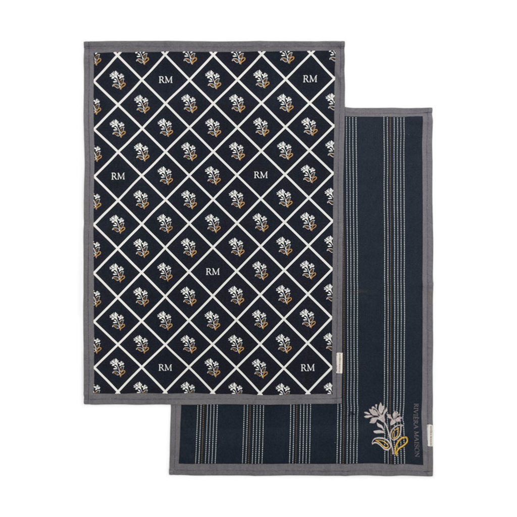 Ručníky ze série Romance D'Amour pro všechna jídla z této série. V kuchyni vypadají dobře a dobře schnou. Jedna ze dvou utěrek je zdobená potiskem, druhá má krásnou výšivku. Černé s bílým a zlatým barevným dekorem, obě s monogramem Rivière Maison.