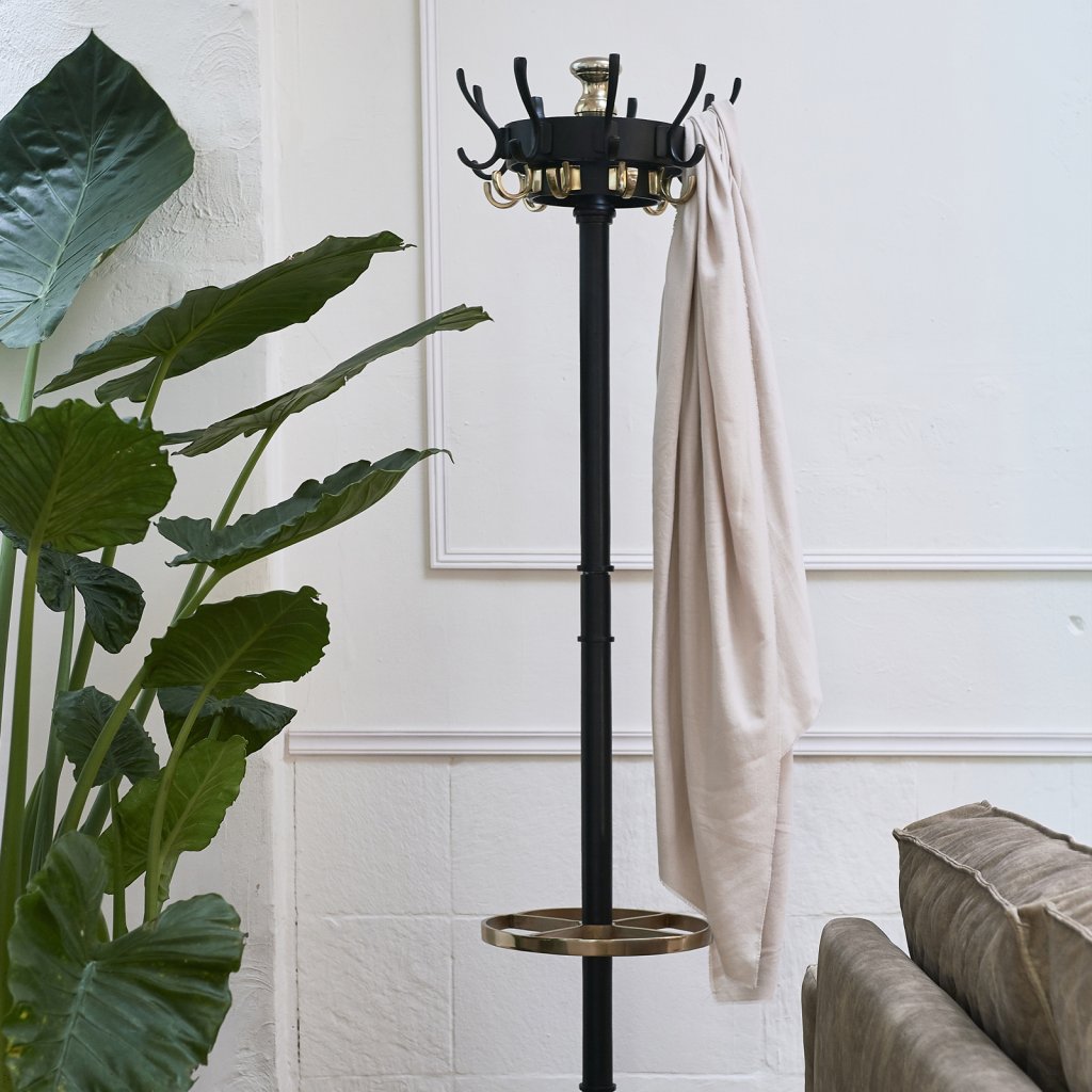 Tento věšák vypadá trochu jako věšák v pěkné kavárně. Vyzařuje z něj útulnost. Ručně vyrobený z černého práškově lakovaného hliníku, s výjimkou některých částí. Lze na něj zavěsit spoustu kabátů. A dokonce se do něj dají uložit i deštníky. A nezabere ani tolik místa.