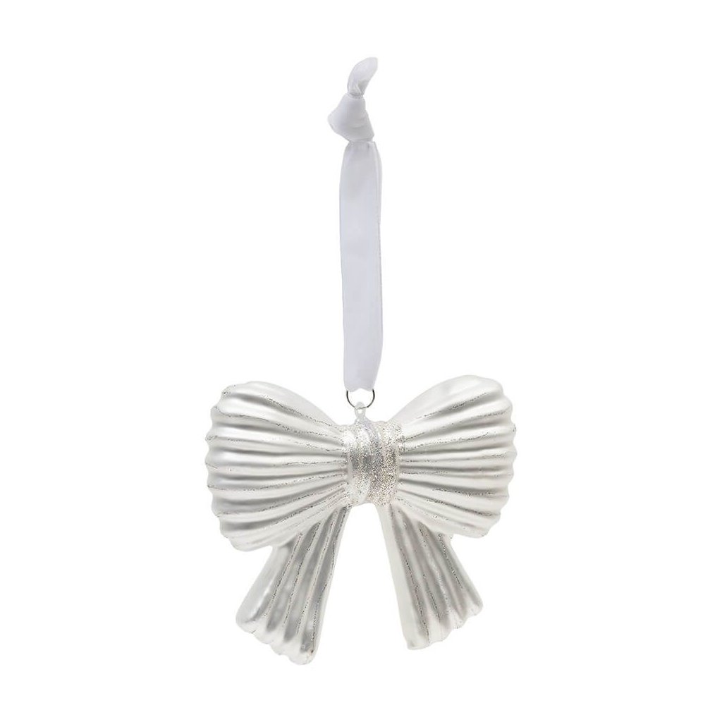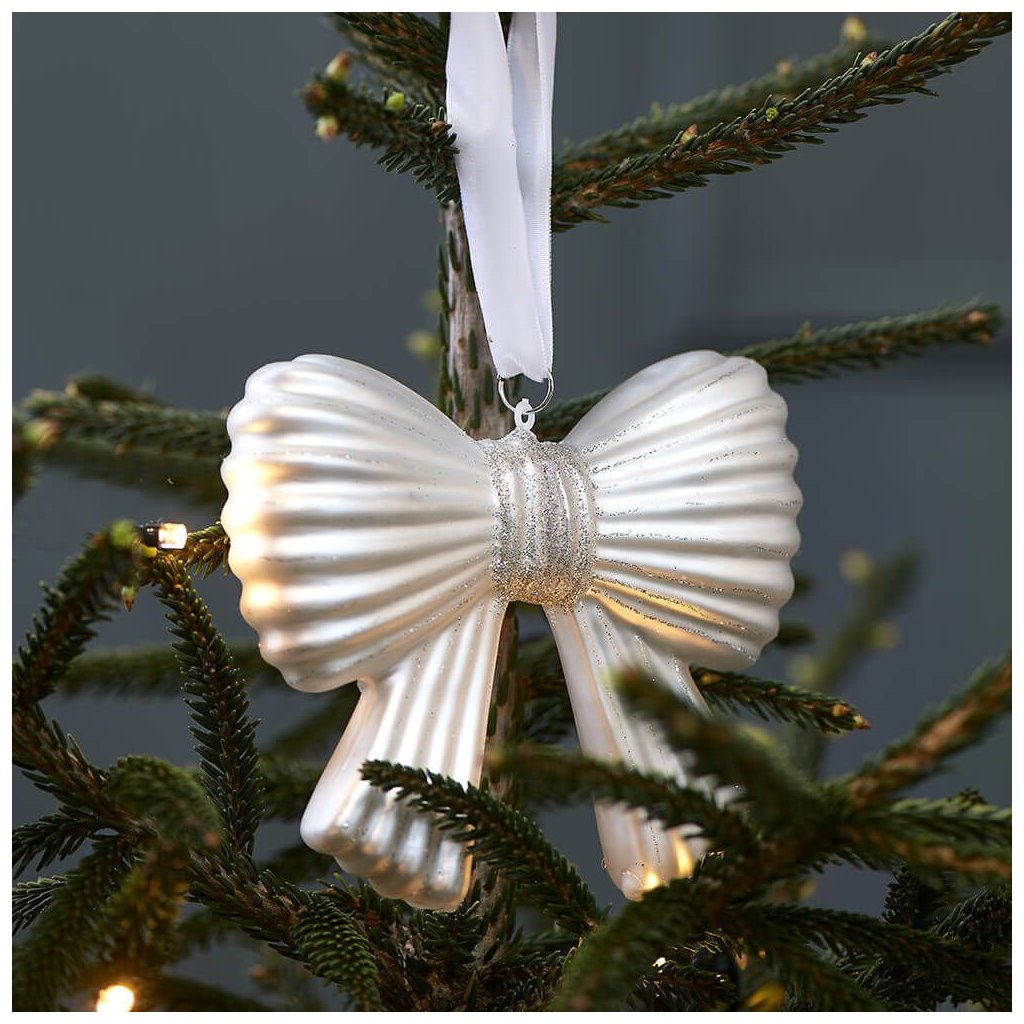 Střední třpytivá mašle M je krásná, lehká mašle na vánoční stromek. Vánoční ozdoba je vyrobena ze skla a má matný povrch s lesklou perletí. Sklo se pyšní stříbrnými třpytkami. Ozdoba visí na bílé závěsné stuze. K dostání také v jiných velikostech a tvarech.