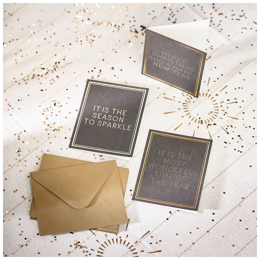 S vánočními přáními Wonderful Time 9 ks můžete svým blízkým popřát krásné svátky ve velkém stylu. Devět vánočních přání v černé a zlaté barvě zdobí tři texty. Včetně obálek.Text: