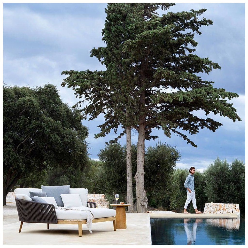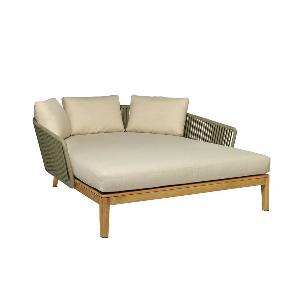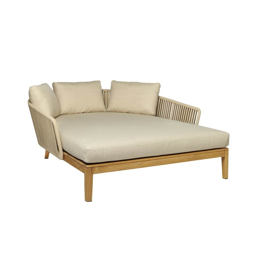 Lehátko Mood Teak Chaise Lounge vyrobené z nejkvalitnějšího teakového dřeva a výpletu Tricord® z polyolefinu je odolné vůči povětrnostním vlivům, ale zároveň má velmi jemný vzhled.